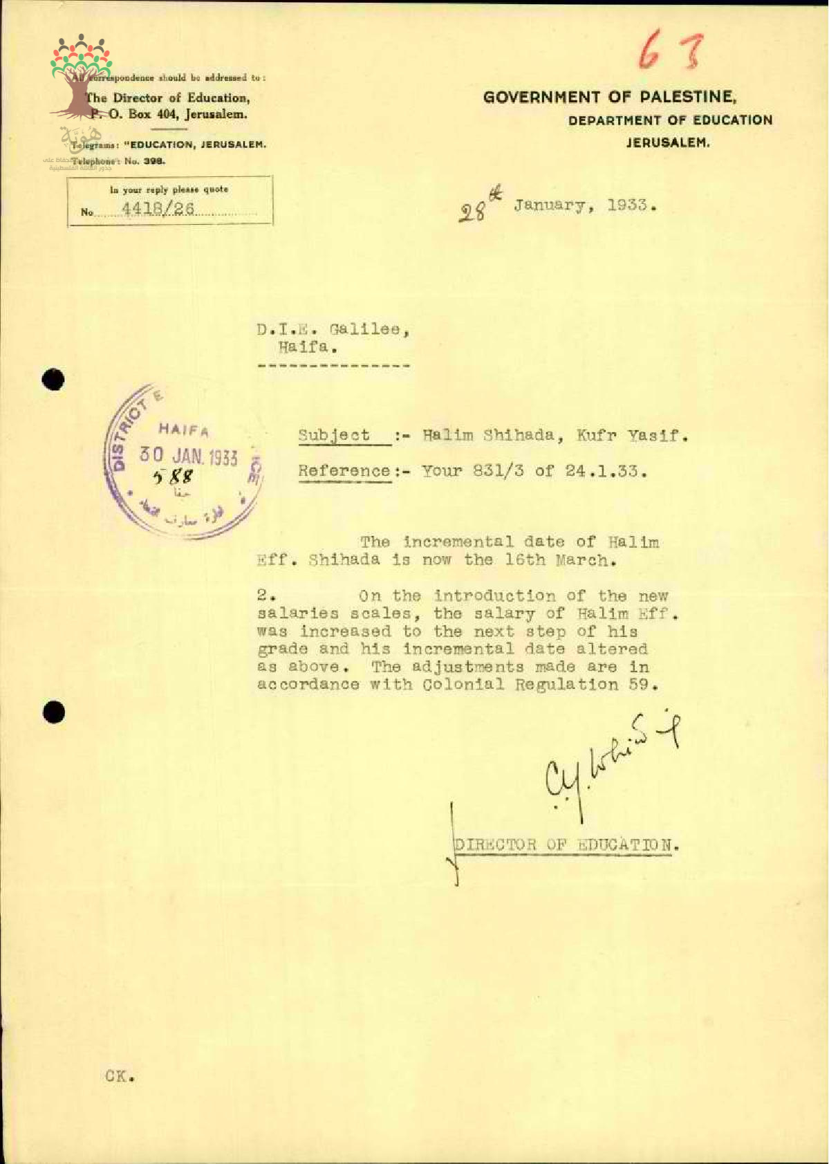 رسالة من مدير المعارف الى مفتش المعارف يخبره بموعد زيادة راتب المعلم حليم شحادة