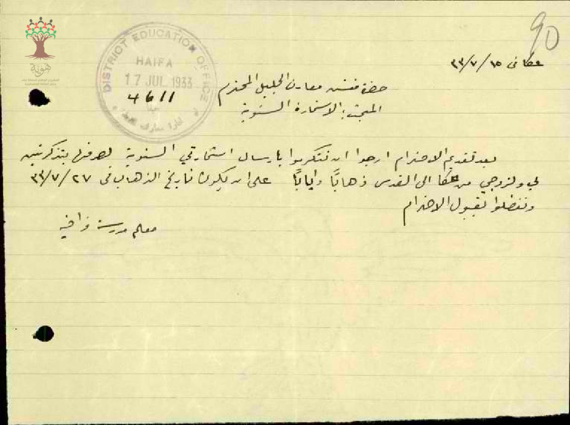 رسالة من معلم مدرسة فراضية رشاد سعد الدين إلى حضرة مفتش معارف الجليل يخصوص الإستمارة السنوية