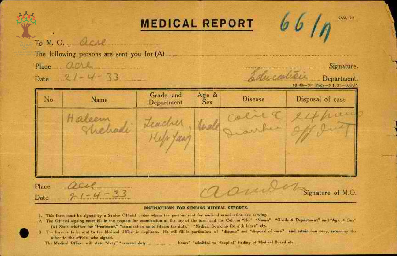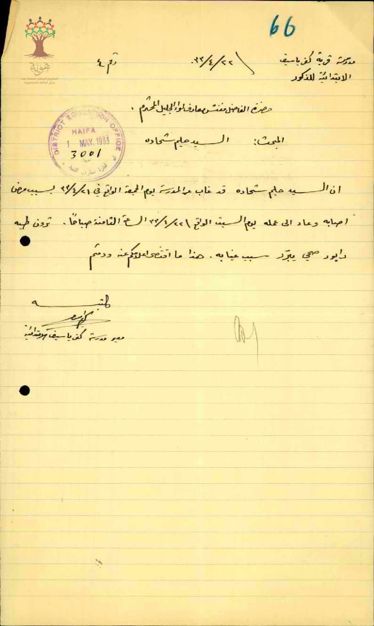 رسالة من مدير مدرسة كفر ياسيف الى مفتش المعارف بخصوص تغيب المعلم حليم شحادة بسبب المرض مرفقة بالتقرير الطبي
