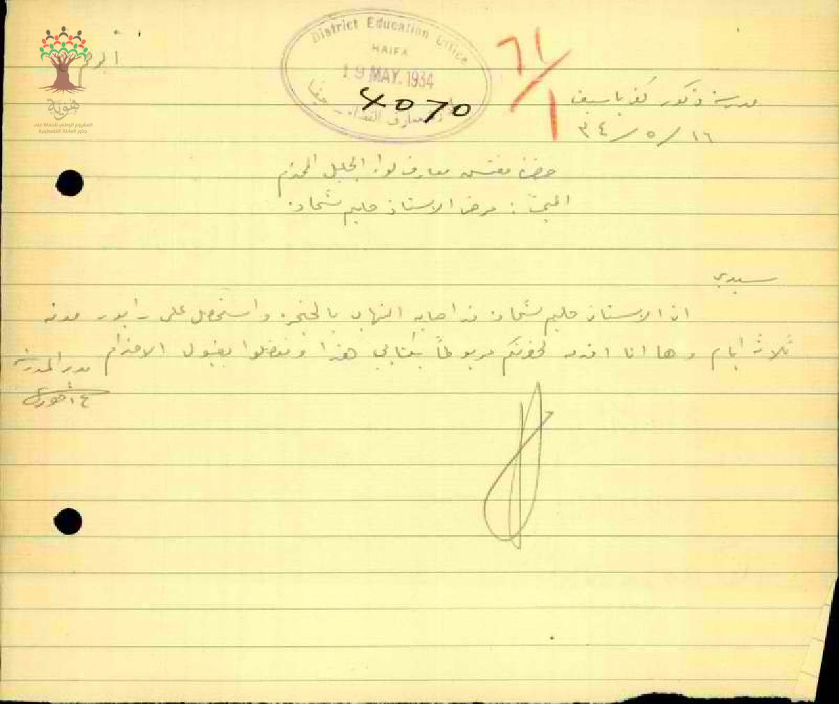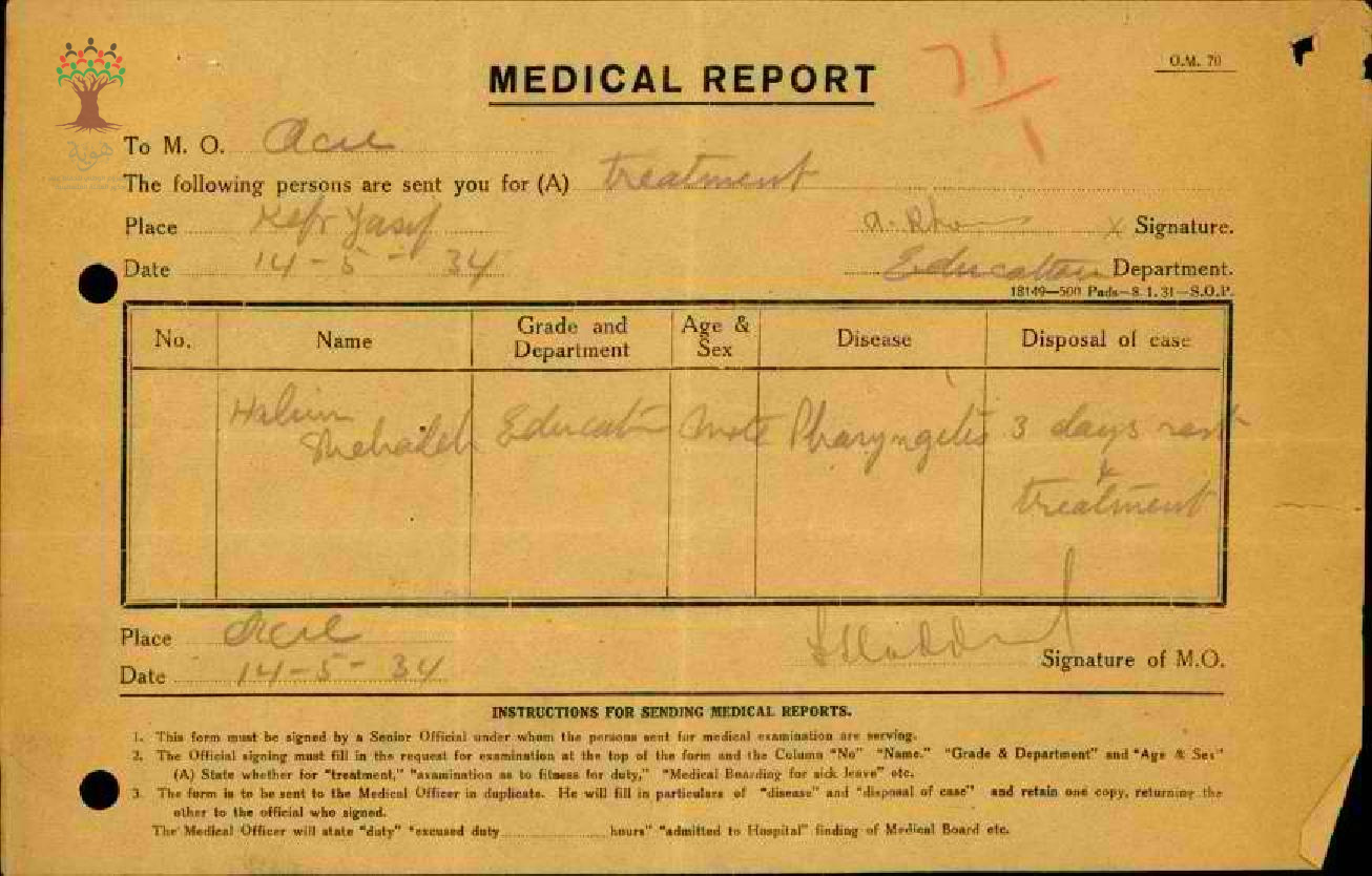 رسالة من مدير مدرسة كفر ياسيف الى مفتش المعارف بخصوص تغيب المعلم حليم شحادة بسبب المرض مرفقة بالتقرير الطبي
