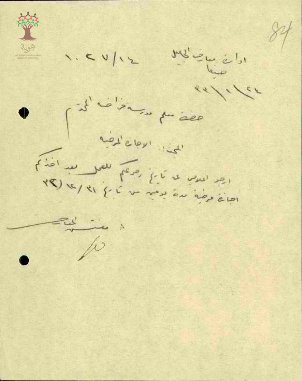 رسالة من مفتش معارف الجليل إلى معلم مدرسة قرية فراضية رشاد سعد الدين بخصوص الإجازة المرضية
