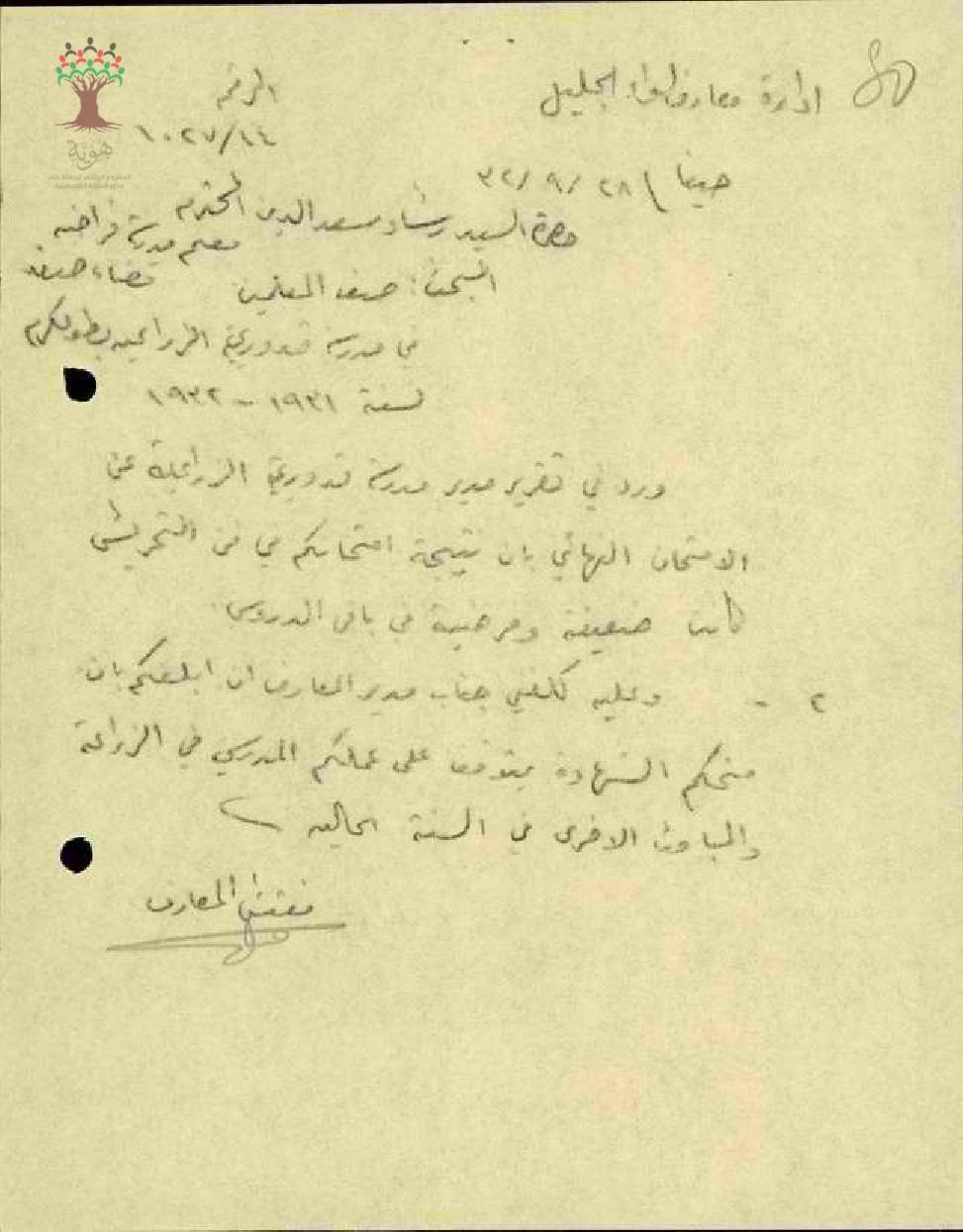 رسالة من مفتش معارف الجليل إلى معلم مدرسة قرية فراضة رشاد سعد الدين بخصوص صف المعلمين في مدرسة قدوري الزراعية بطول كرم