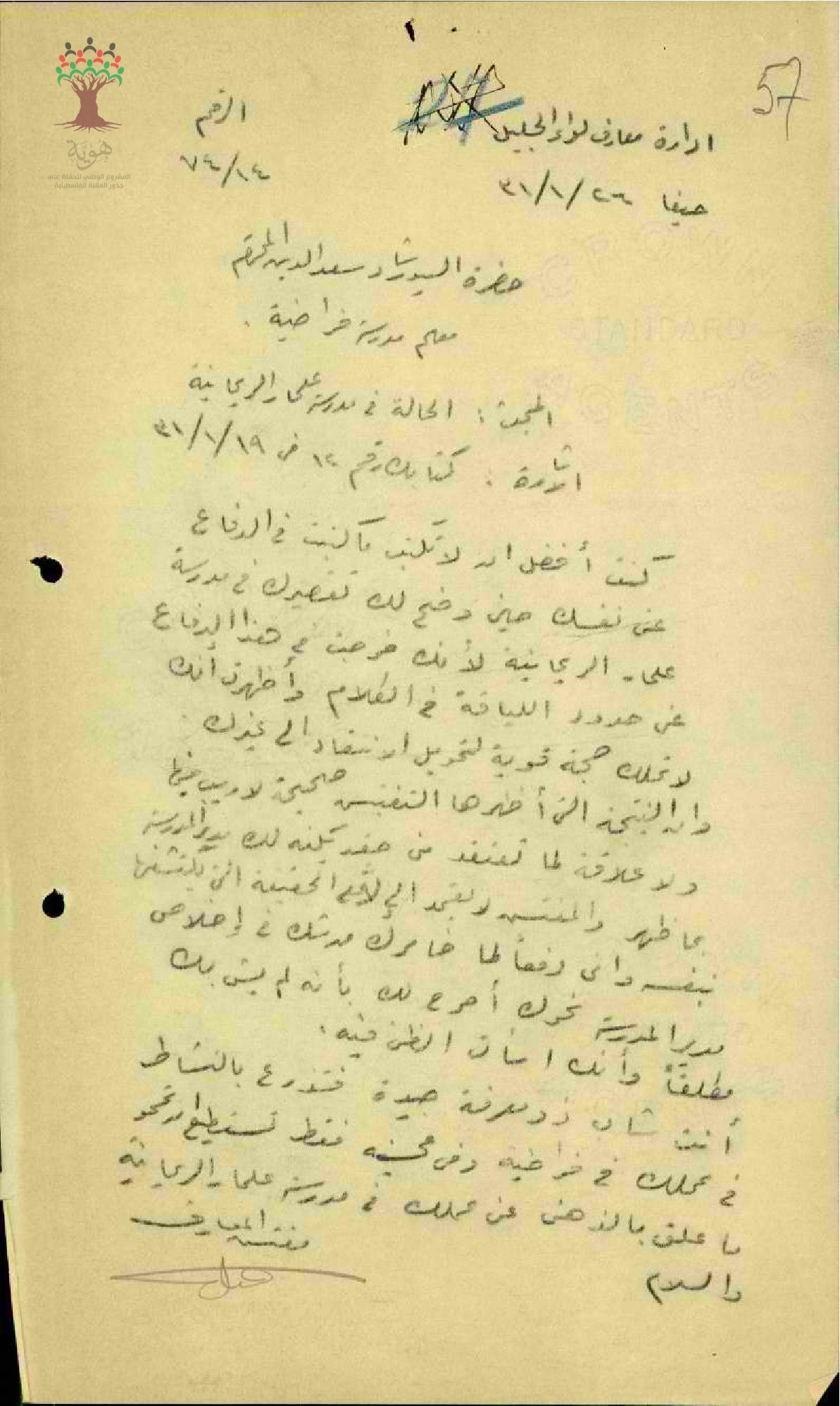 رساله من مفتش المعارف الى المعلم رشاد سعد الدين يخصوص الحالة في مدرسة علما الريحانية