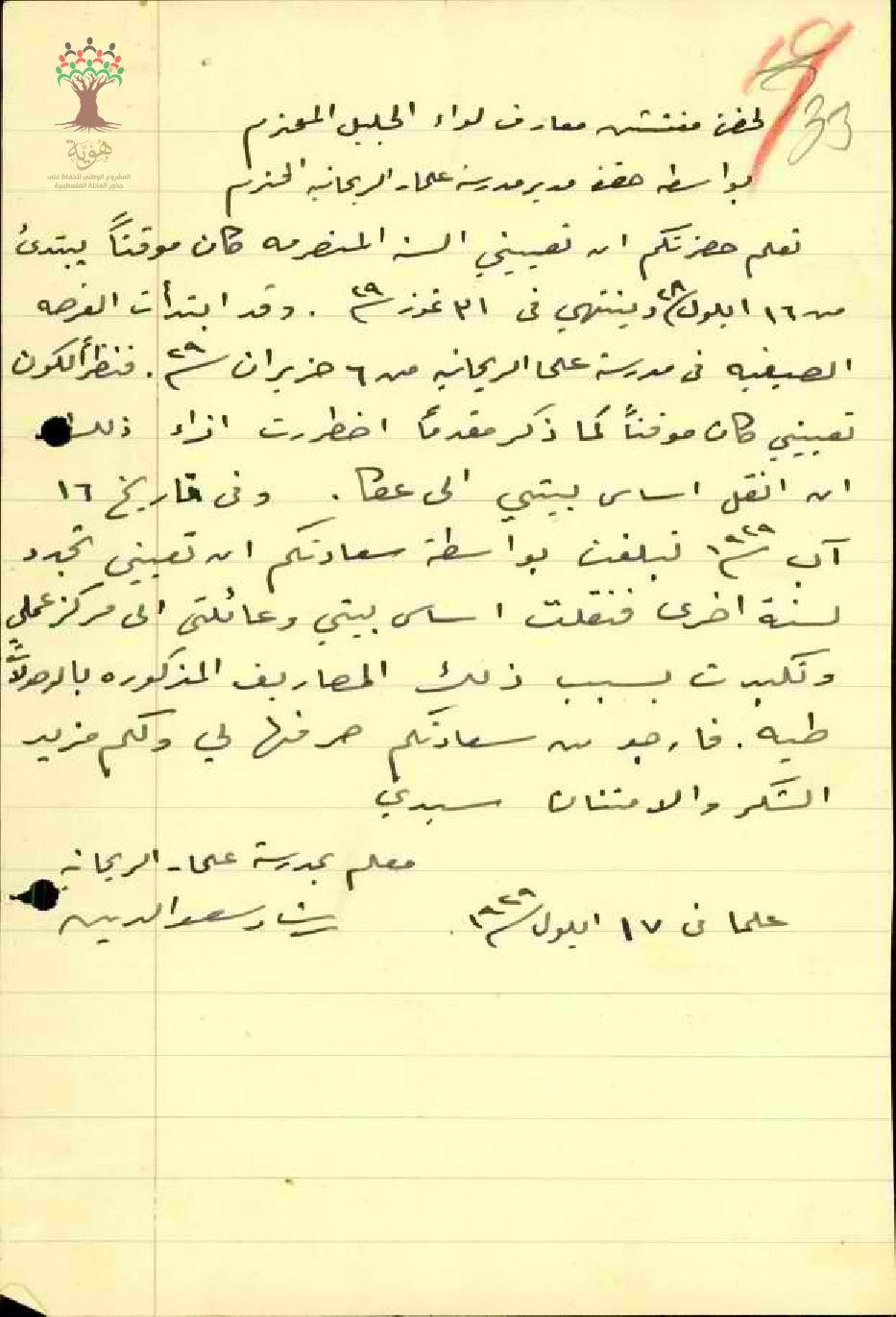رساله من المعلم رشاد سعد الدين الى مفتش معارف الجليل بخصوص التعين في مدرسة علما الريحاينه