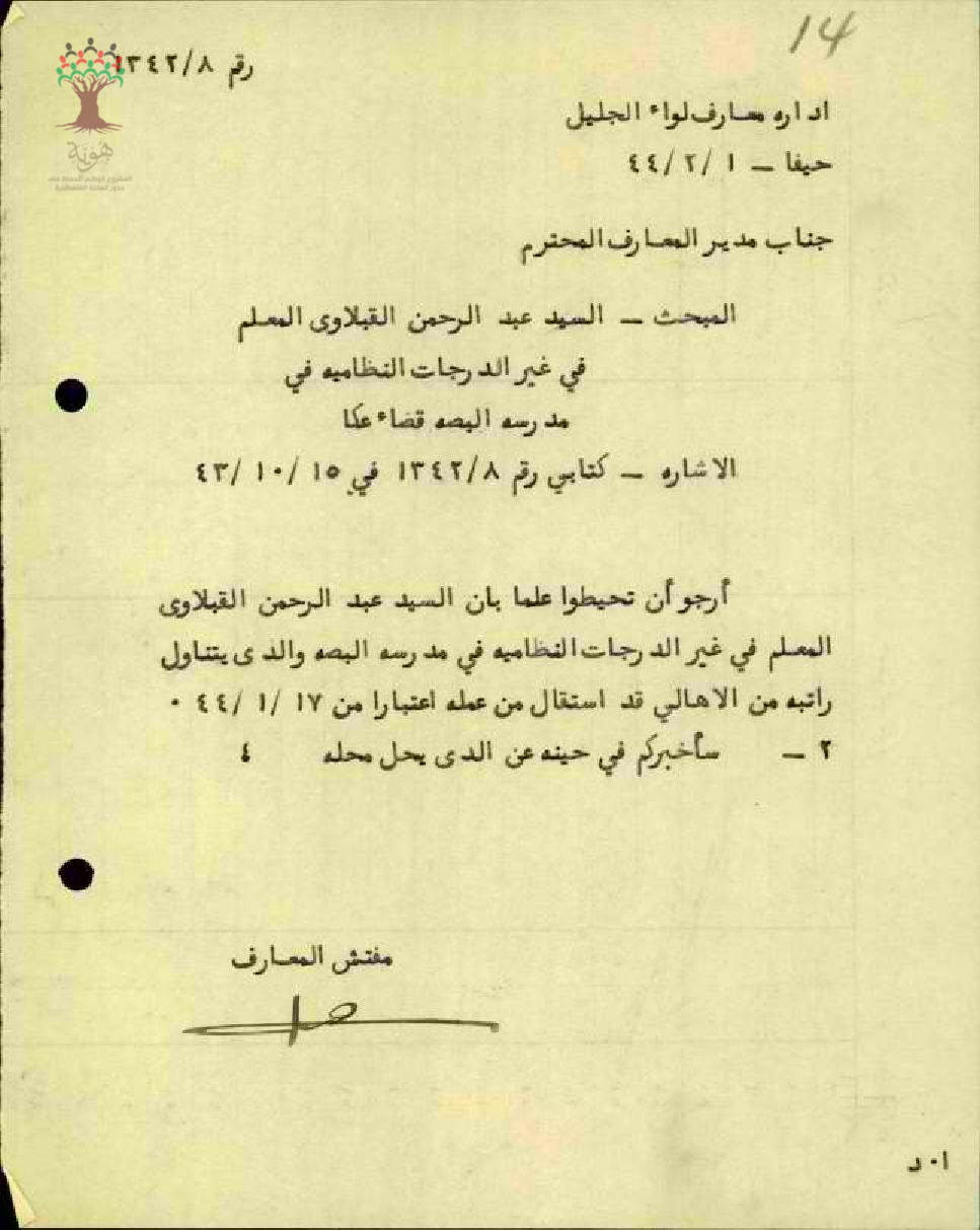 رساله من مفتش المعارف الى المعلم عبد الرحمن قبلاوي بخصوص الدرجات النظاميه في مدرسة البصه قضاء عكا