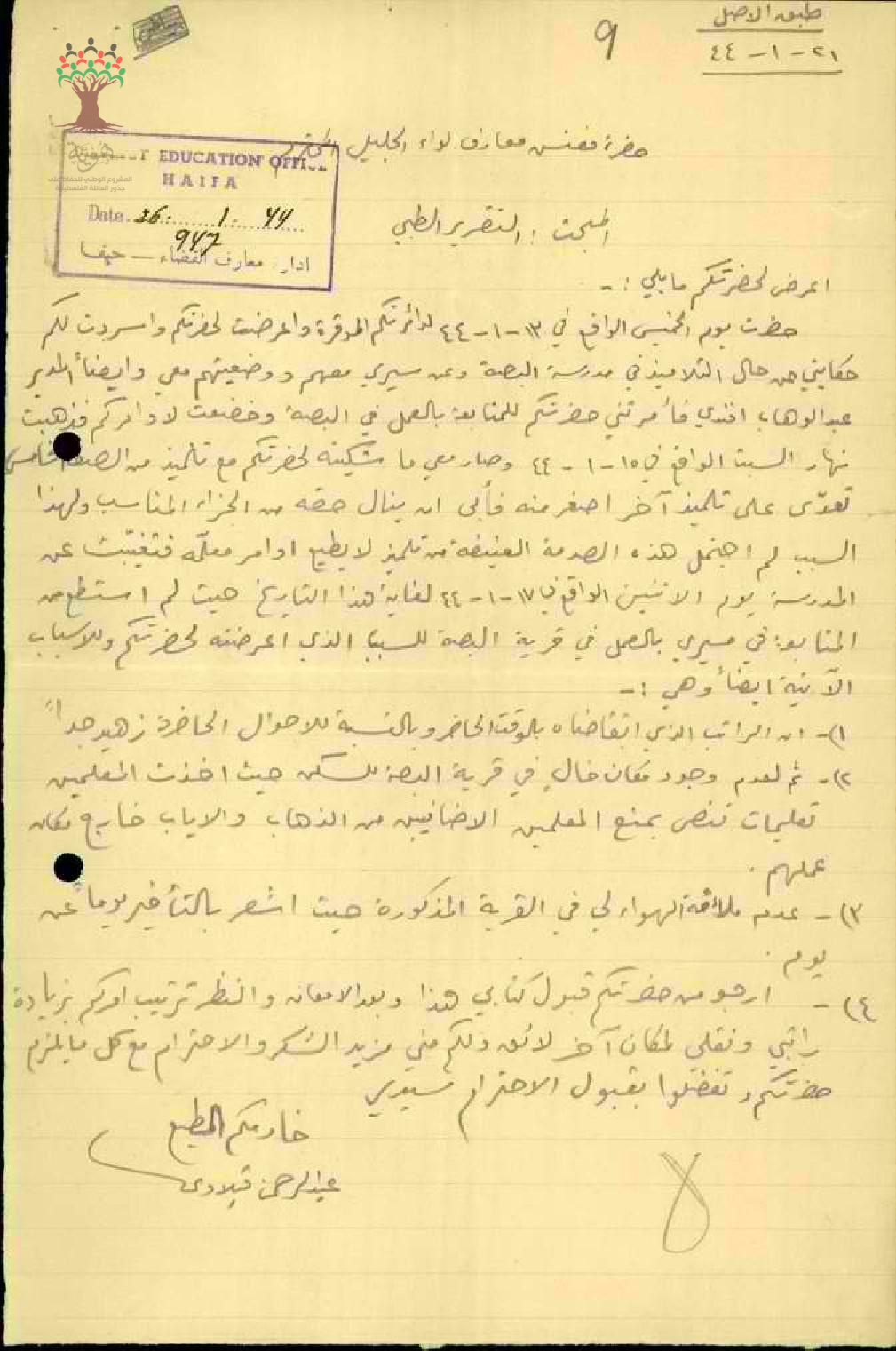 رساله من المعلم عبد الرحمن قبلاوي الى مفتش معارف الجليل بخصوص التقرير الطبي