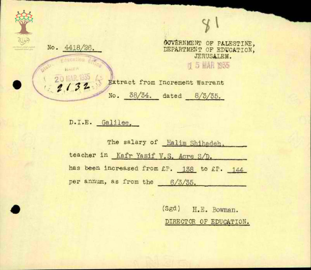 رسالة من مدير المعارف الى مفتش المعارف بخصوص زيادة راتب المعلم حليم شحادة السنوية