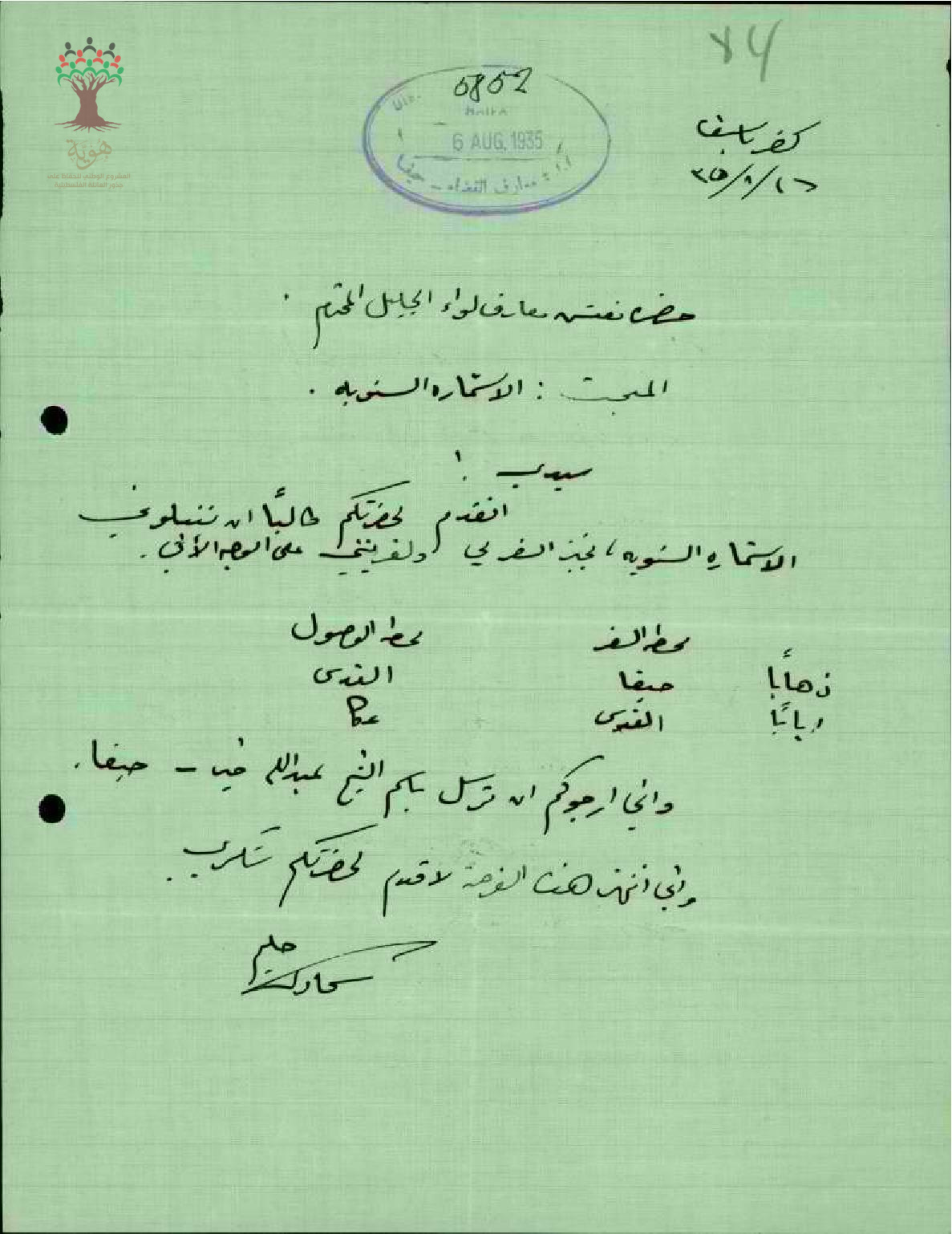 رسالة من المعلم حليم شحادة الى مفتش المعارف يطلب فيها استمارته السنوية