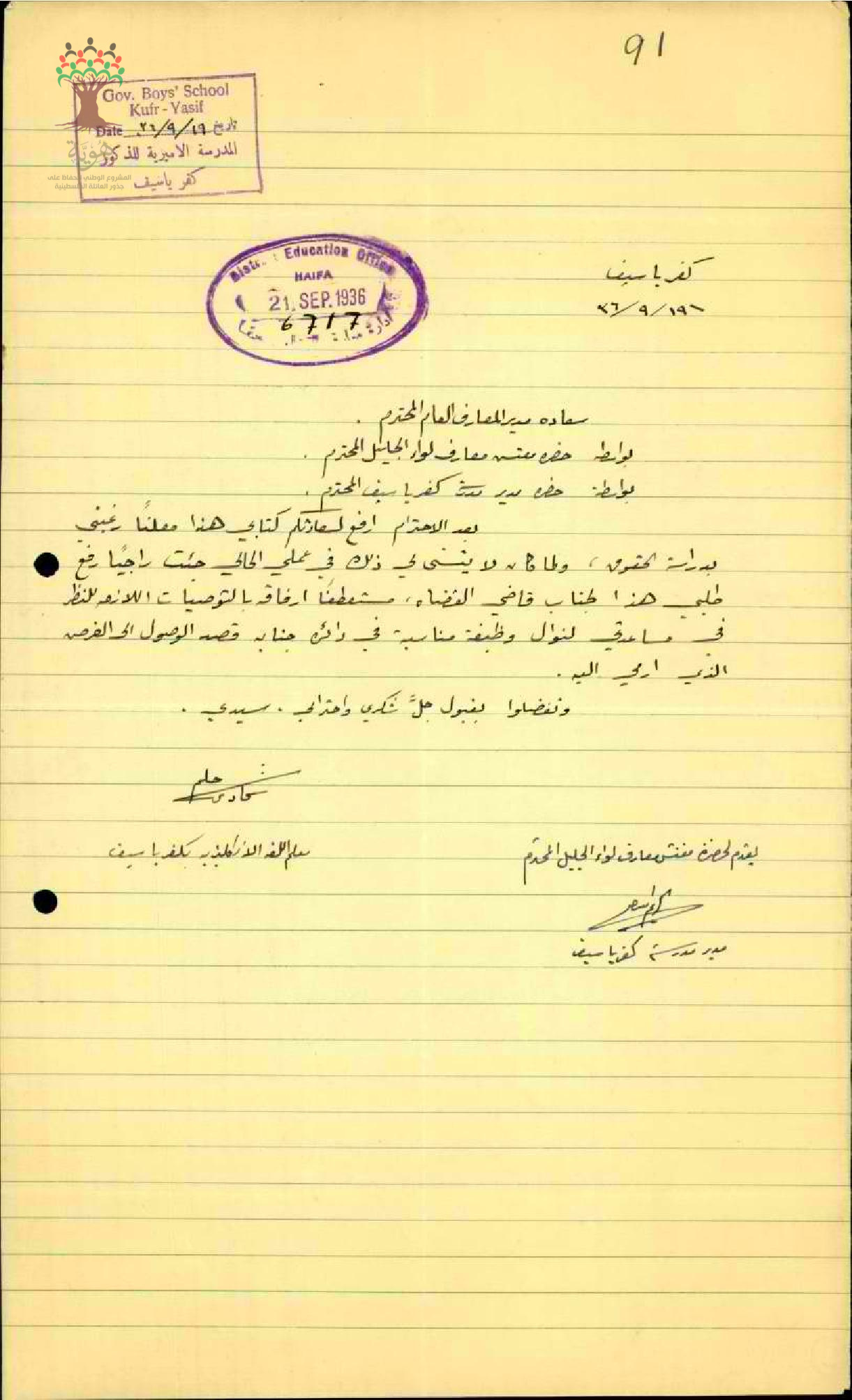 رسالة من المعلم حليم شحادة الى مفتش المعارف يطلب ايجاد وظيفة له في دوائر العدلية وذلك لرغبته في دراسة الحقوق