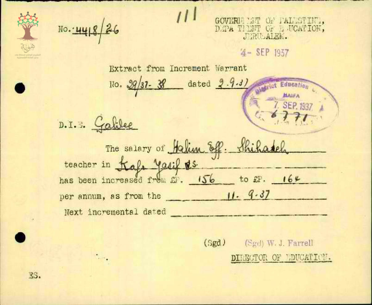 رسالة من مدير المعارف الى مفتش المعارف بخصوص زيادة راتب المعلم حليم شحادة السنوية