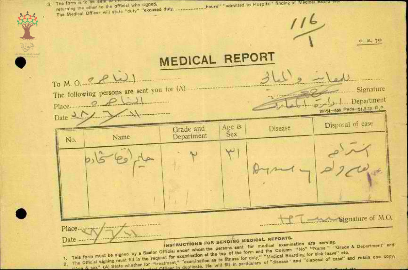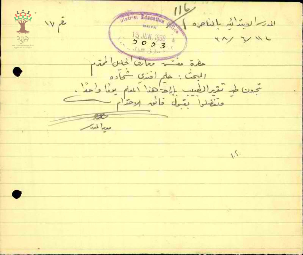رسالة من المعلم حليم شحادة الى مفتش المعارف بخصوص تغيبه عن العمل مرفقة بالتقرير الطبي