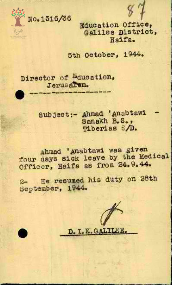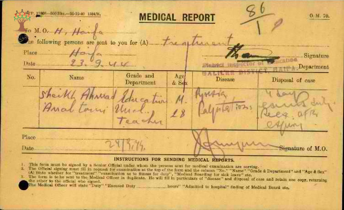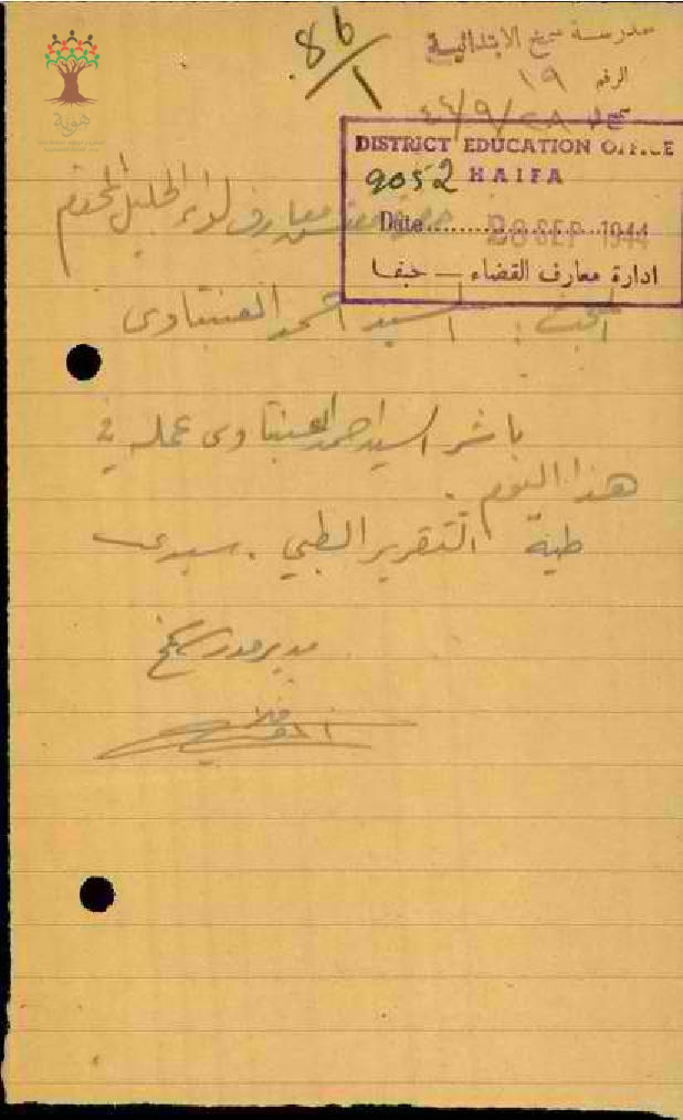 رسالة من مدير مدرسة سمخ إلى مفتش المعارف يعلمه بمباشرة المعلم أحمد عنبتاوي عمله في المدرسة مرفقاً التقرير الطبي