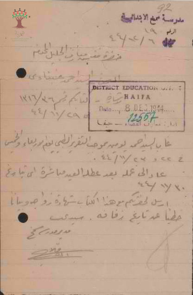 رسالة من مديير مدرسة سمخ إلى مفتش المعارف يخبره بغياب المعلم أحمد عنبتاوي بسبب عقد قرانه