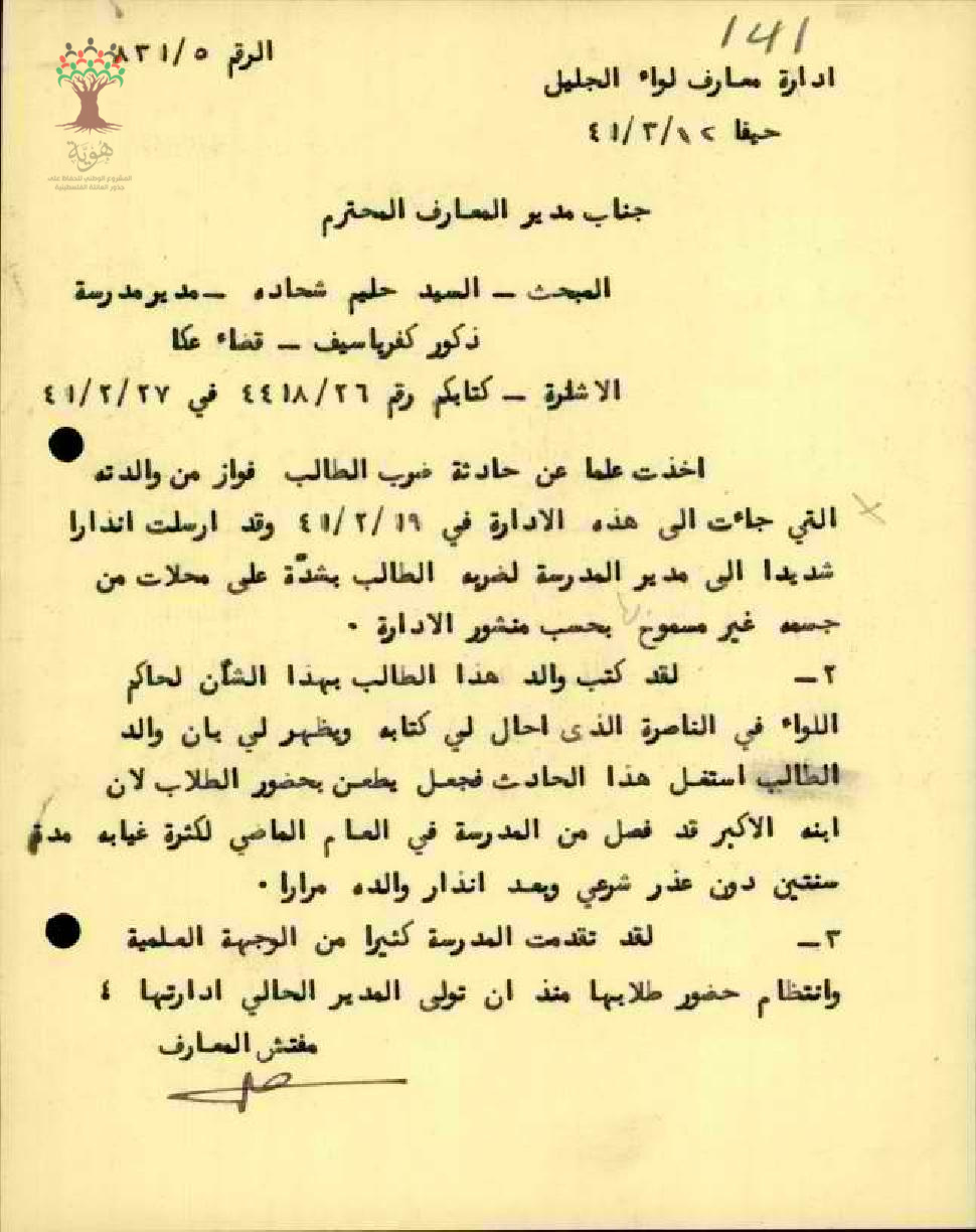 رسالة من مفتش المعارف الى مدير المعارف بخصوص يبحث معه موضوع الشكوى ضد المعلم حليم شحادة