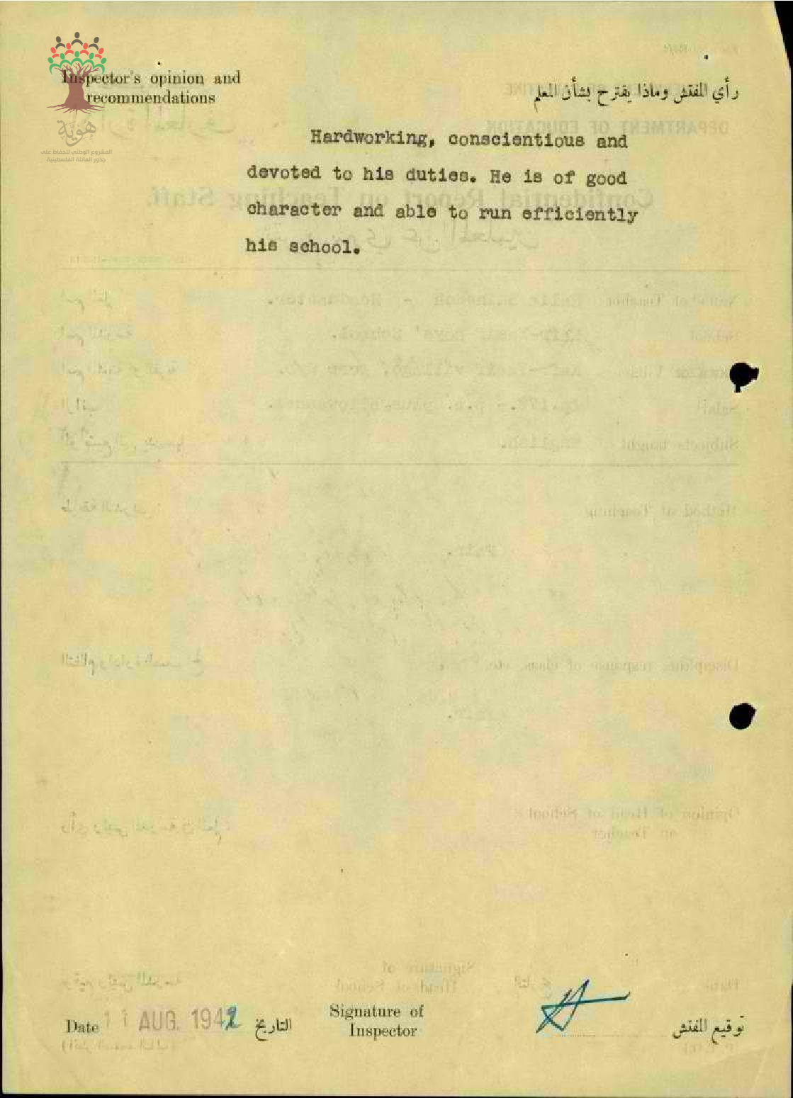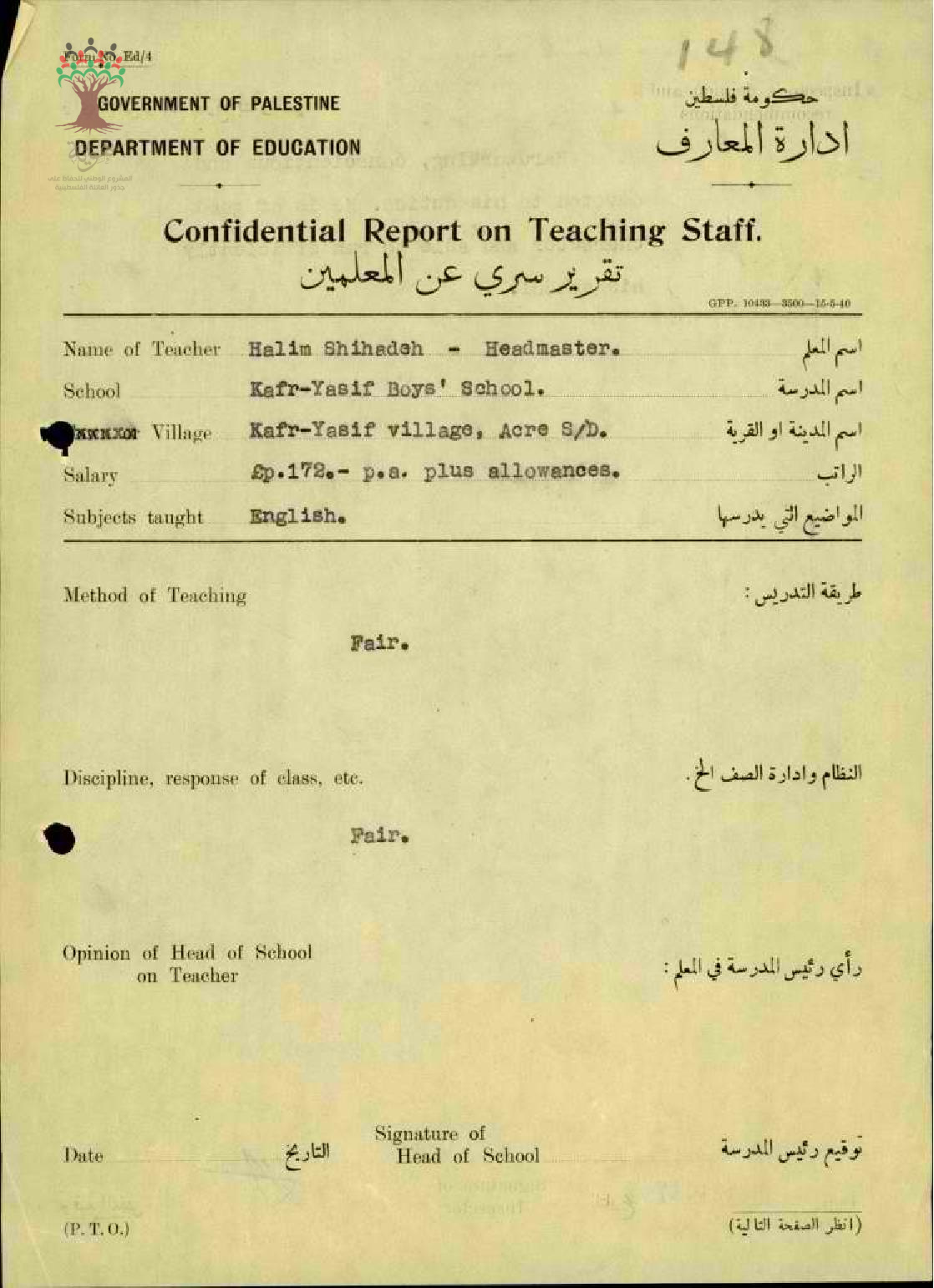تقرير تفصيلي عن أداء المعلم حليم شحادة في مدرسة كفر ياسيف سنة 1942