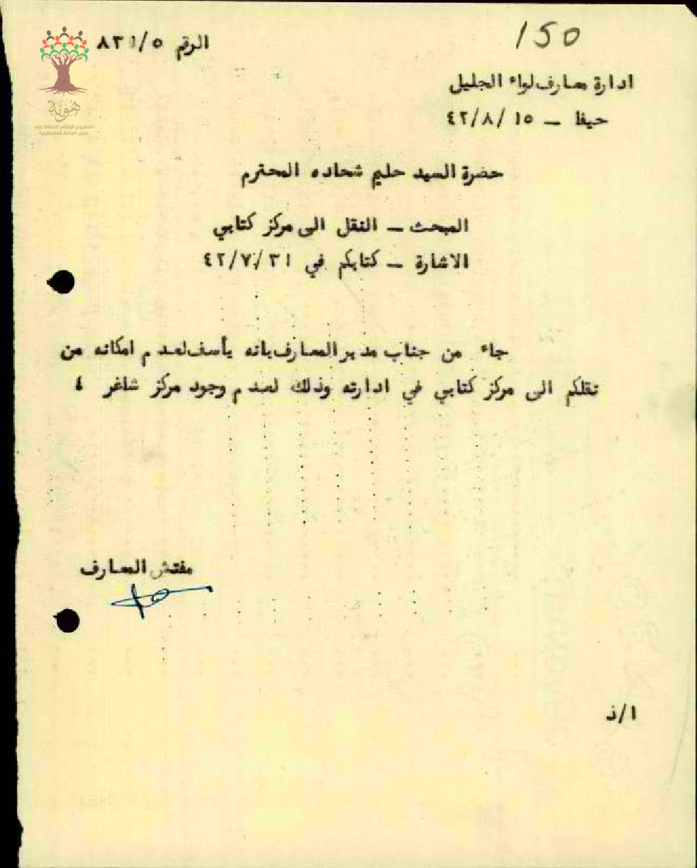 رسالة من مفتش المعارف الى المعلم حليم شحادة بخصوص عدم وجود شاغر كتابي في الدائرة