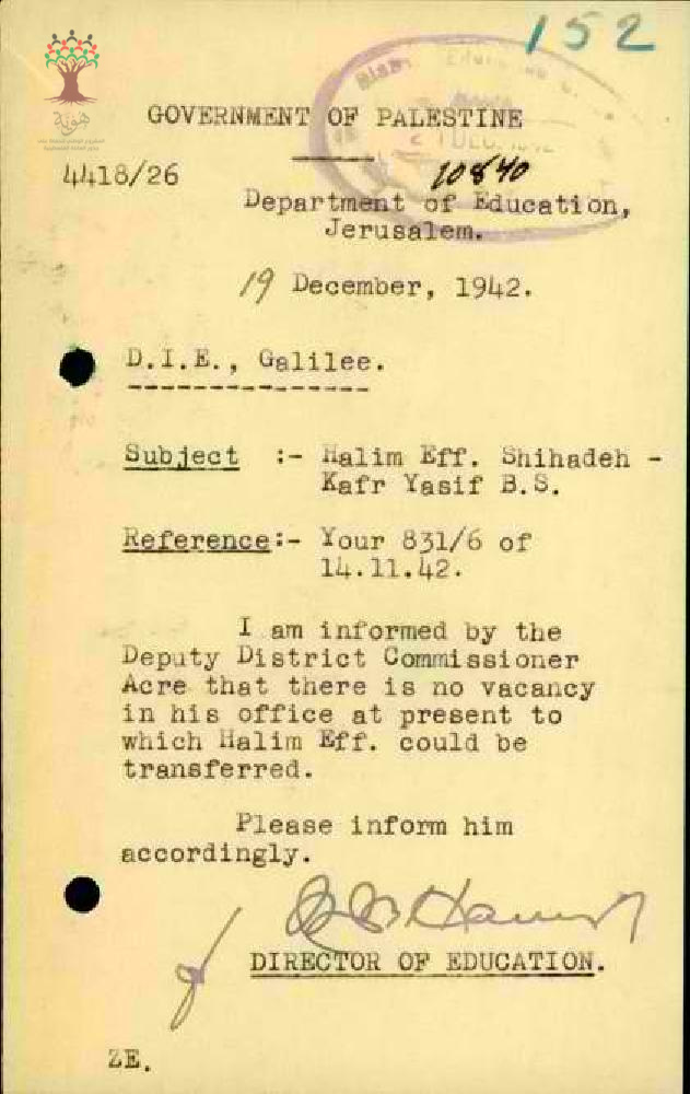 رسالة من مدير المعارف الى مفتش المعارف بخصوص عدم امكانية نقل المعلم حليم شحادة