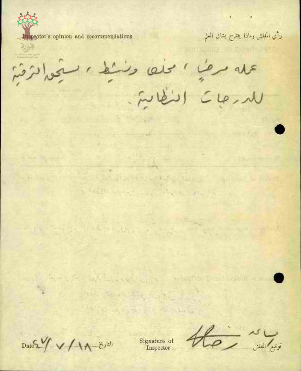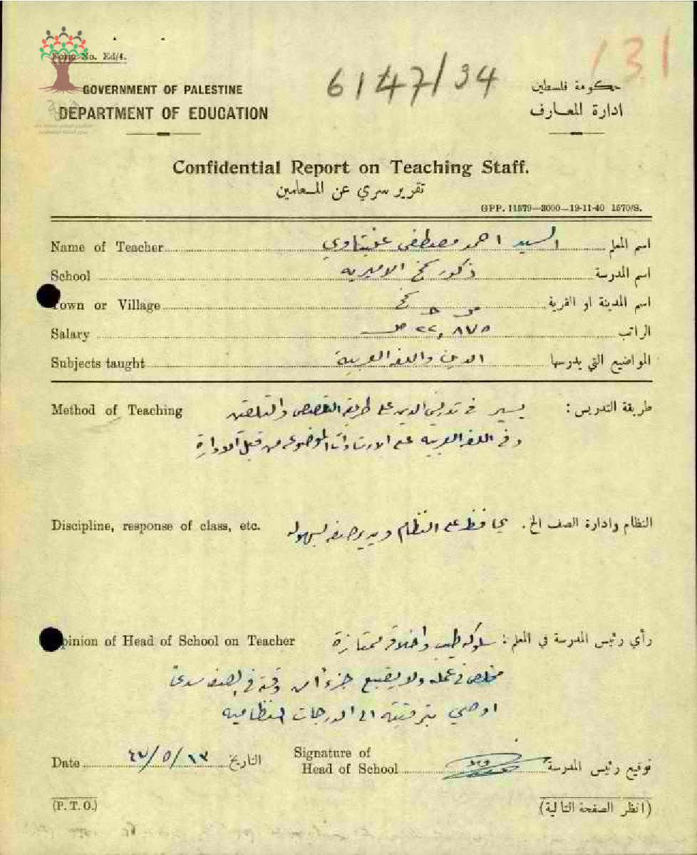 تقرير تفصيلي عن أداء المعلم أحمد عنبتاوي في مدرسة سمخ سنة 1947