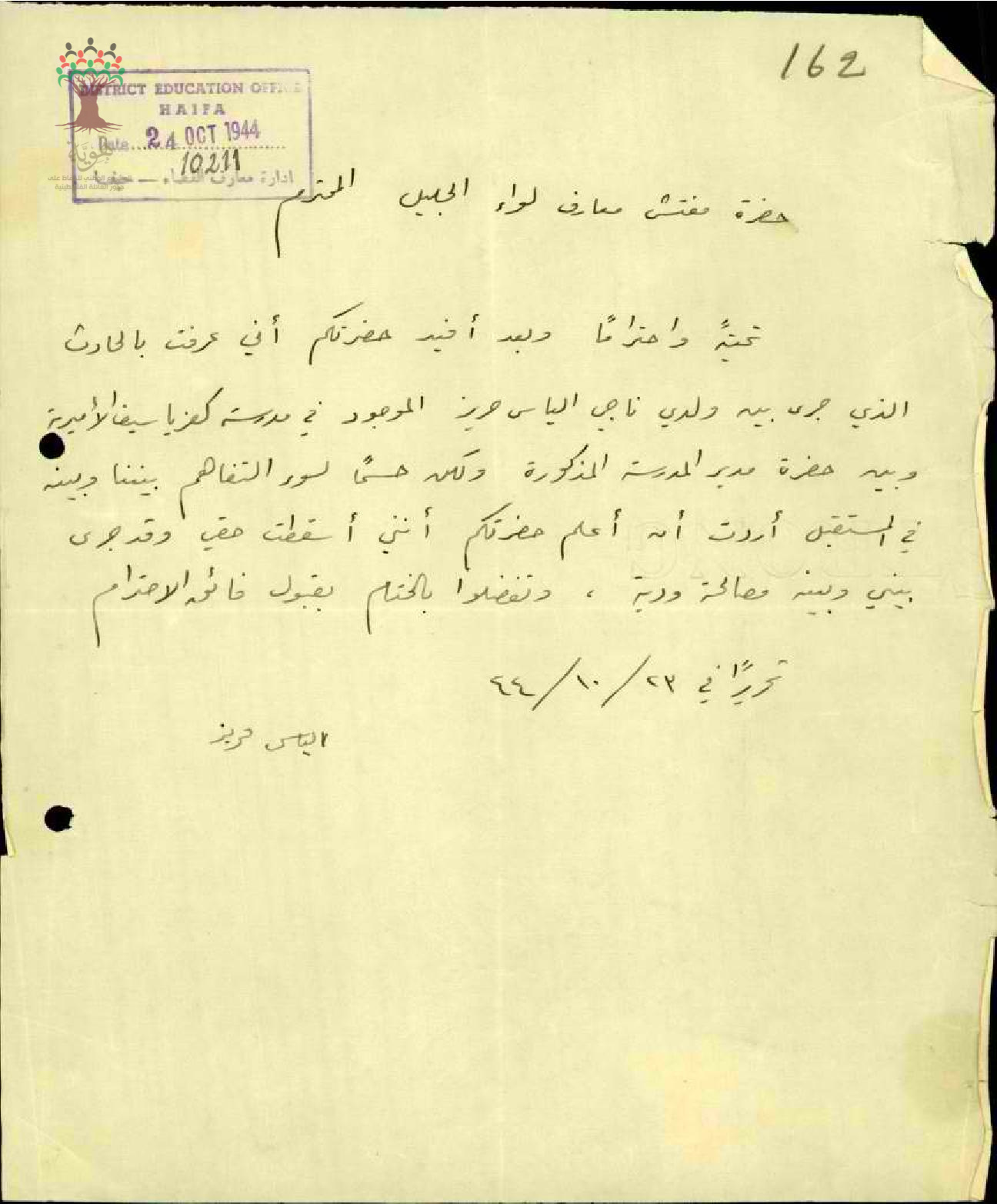 رسالة من ولي أمر أحد الطلاب الى مفتش المعارف يخبره بأنه أسقط حقه في الشكوى التي قدمها ضد العلم حليم شحادة
