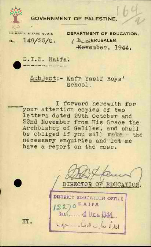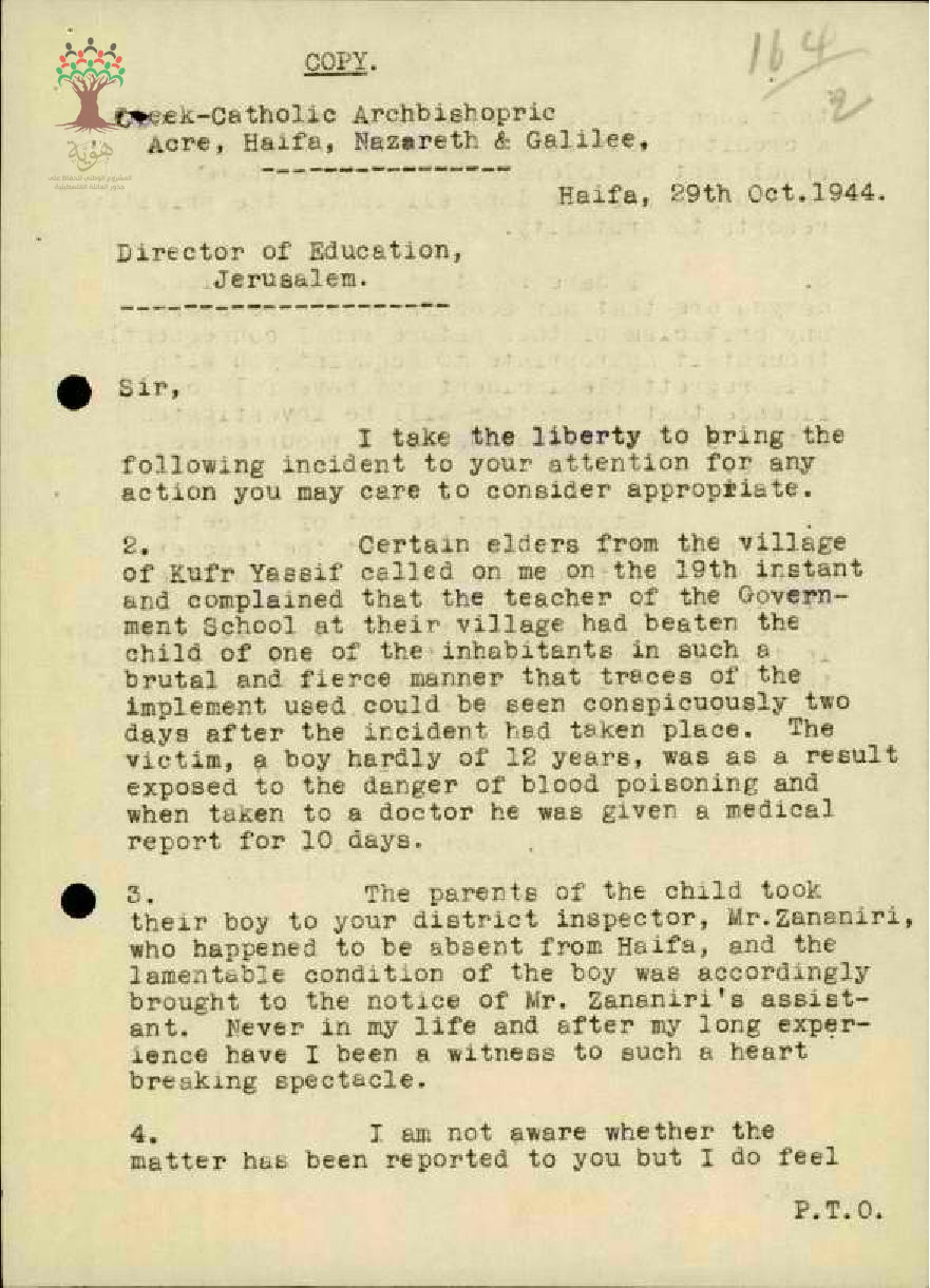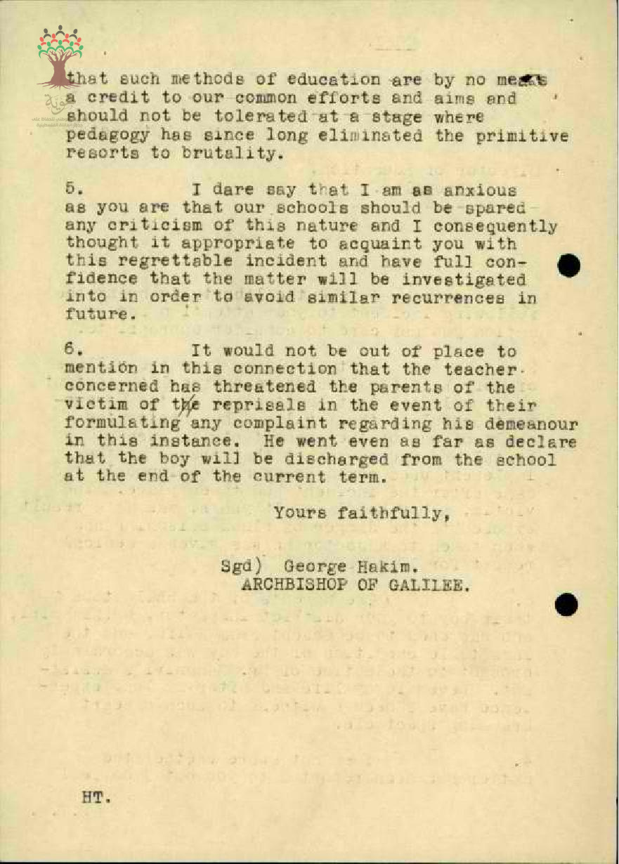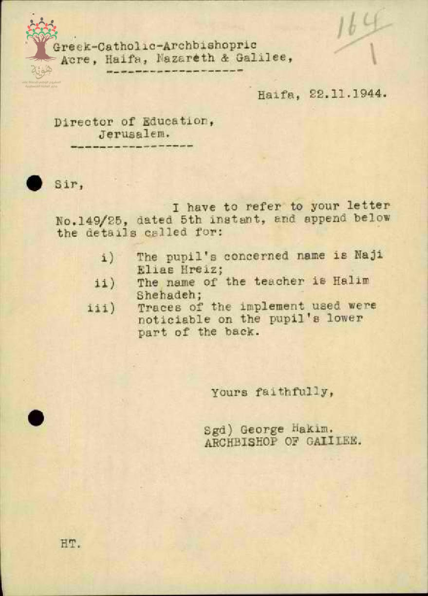 رسالة من مفتش المعارف الى مدير المعارف مرفقة برسالتين من رئيس الأساقفة في الجليل بخصوص الشكوى ضد المعلم حليم شحادة