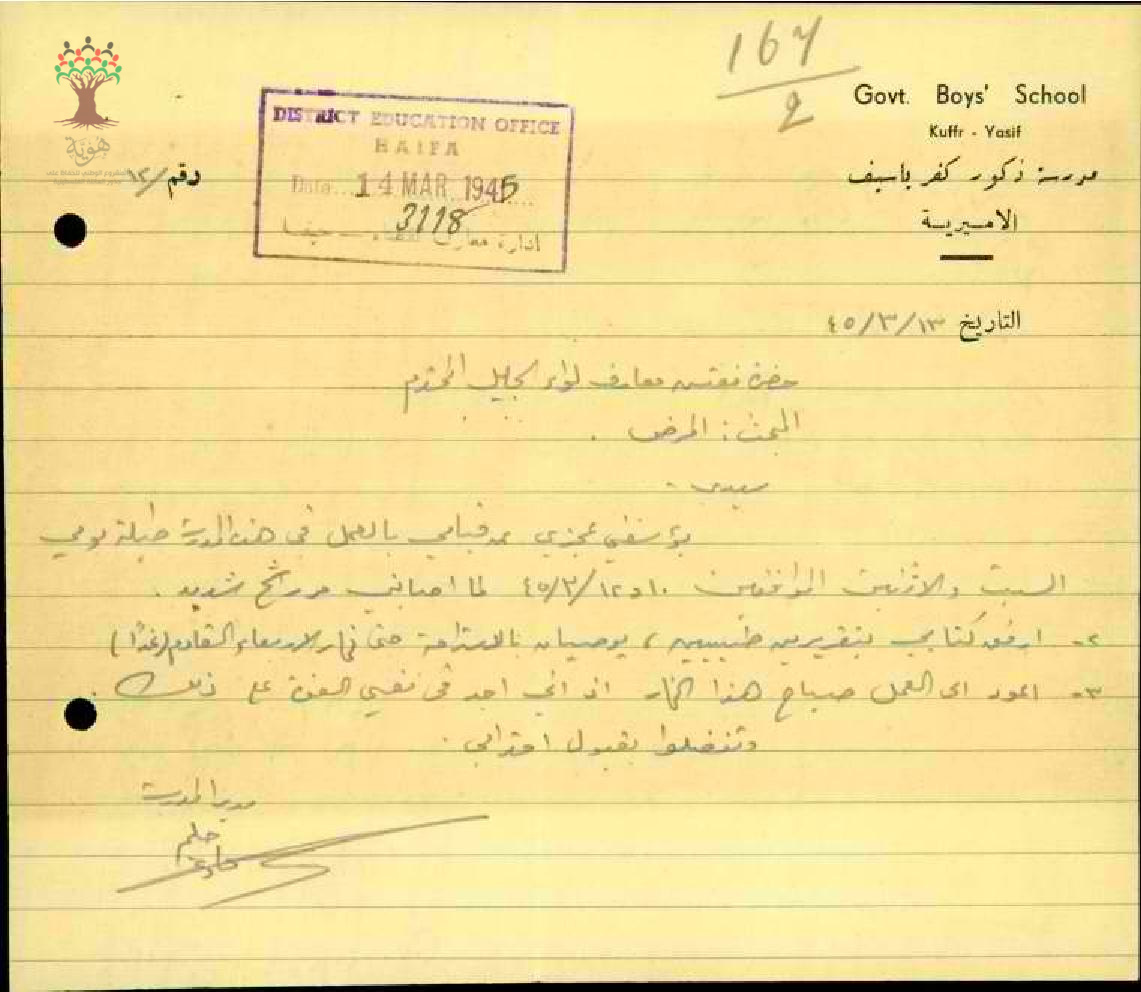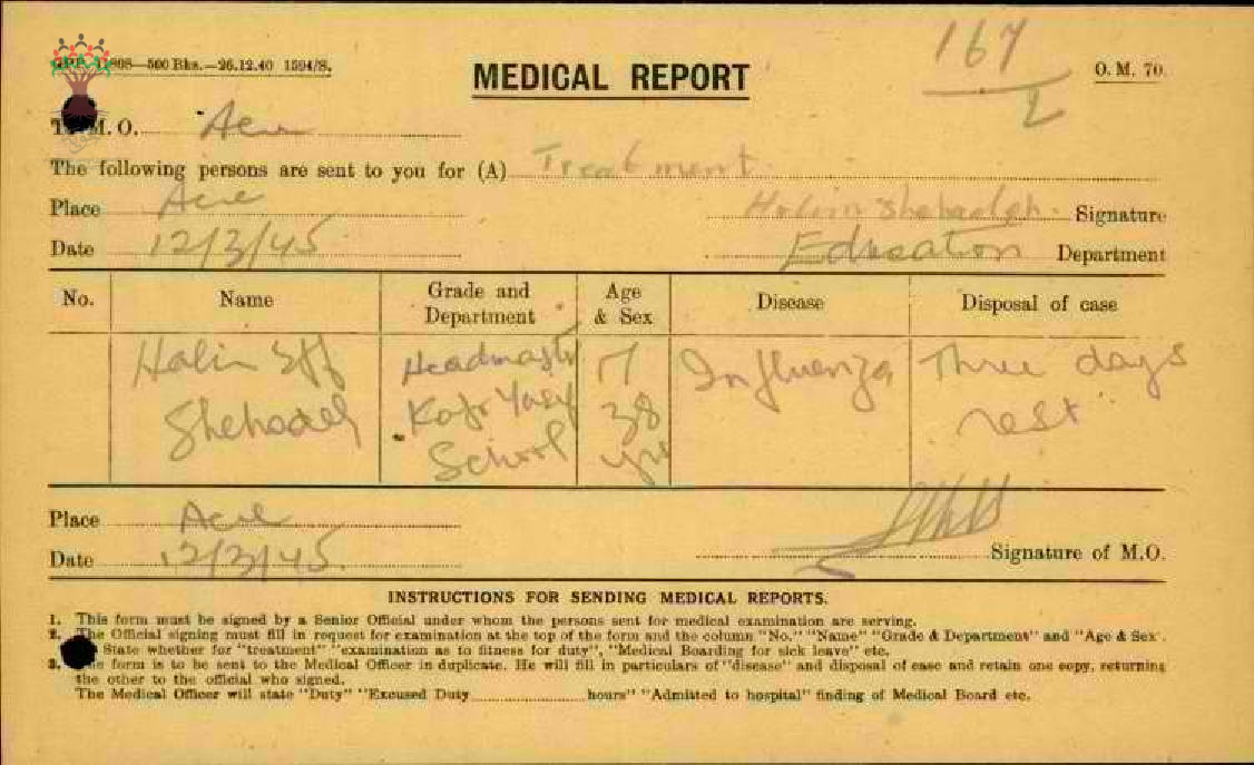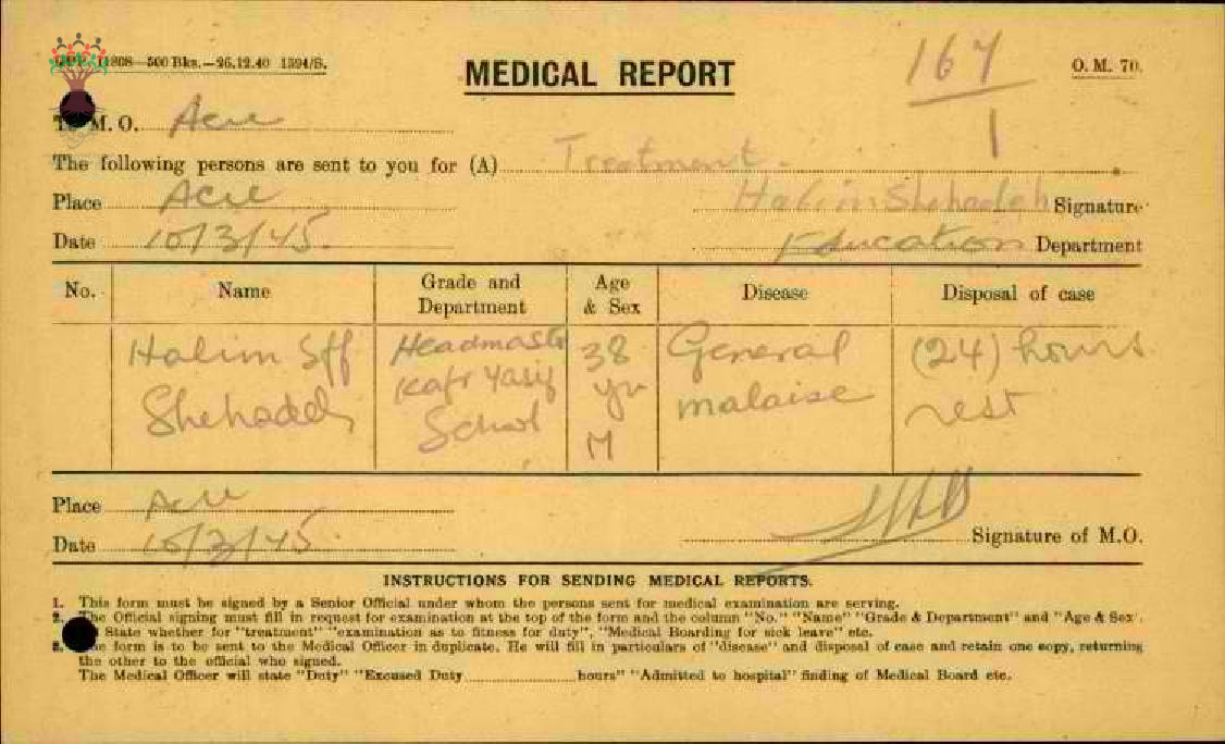 رسالة من المعلم حليم شحادة الى مفتش المعارف بخصوص تغيبه عن العمل مرفقة بالتقارير الطبية