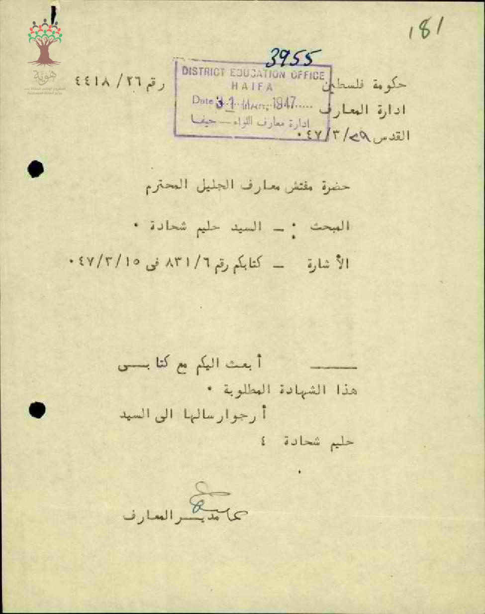 رسائل بخصوص حصول المعلم حليم شحادة على حليم شحادة
