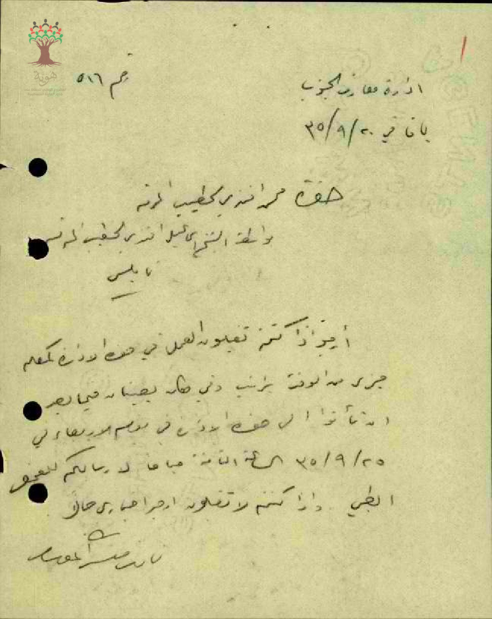 رسالة من نائب مفتش المعارف إلى المعلم محمد الخطيب يرجو اعلامه بقبول العمل في الإدارة