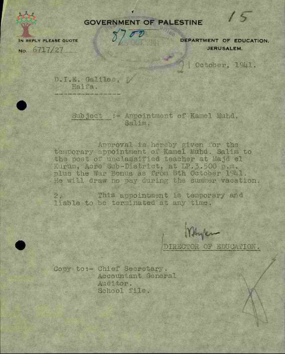 رسالة من مدير المعارف الى مفتش المعارف يوافق على تعييم المعلم كامل سليم محمود