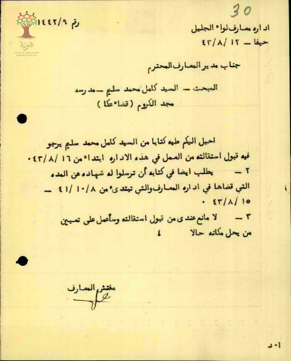 رسالة من مفتش المعارف الى مدير المعارف بخصوص رغبة المعلم كامل سليم محمود بالاستقالة