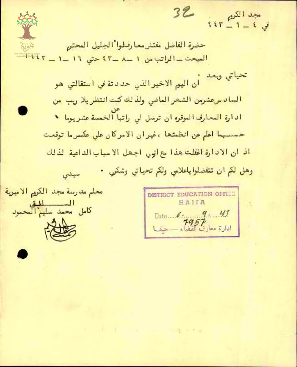 رسالة من المعلم كامل سليم محمود الى مفتش المعارف بخصوص موعد استقالته
