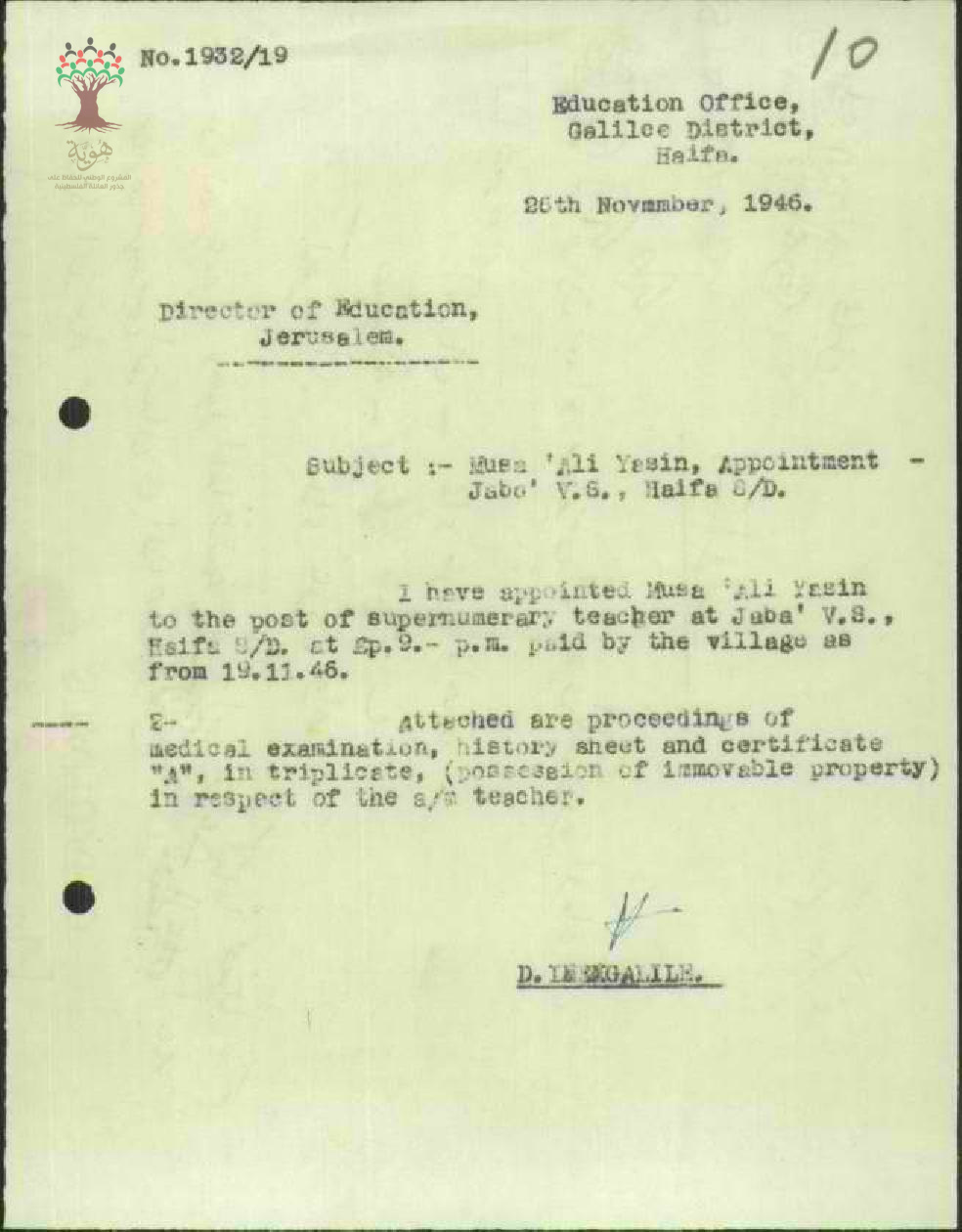 رسالة من مفتش المعارف الى مدير المعارف بخصوص تعيين المعلم موسى ياسين في مدرسة جبع