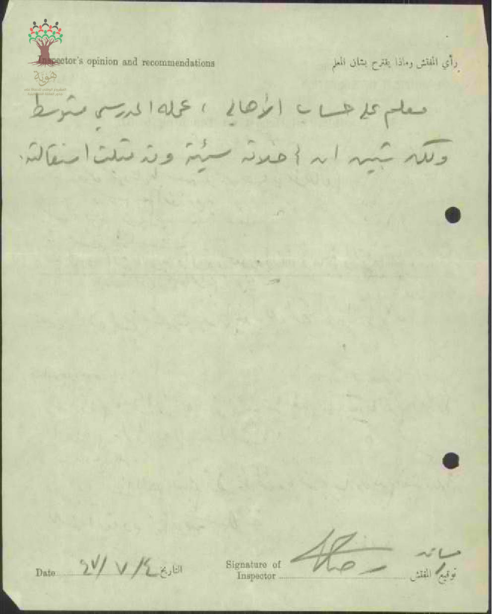 تقرير تفصيلي عن أداء المعلم موسى ياسين في مدرسة جبع سنة 1947