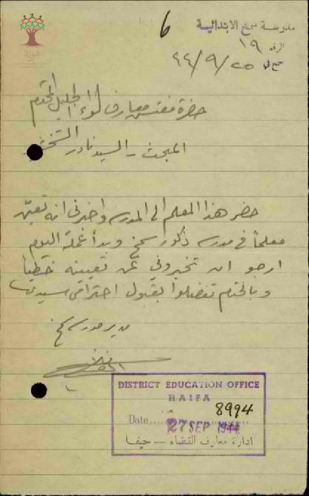 رسالة من مدير مدرسة سمخ الى مفتش المعارف يخبره بأن المعلم نادر الشخشير قد باشر عمله