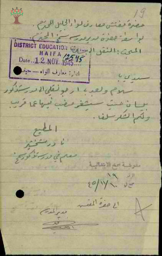 رسالة من المعلم نادر الشخشير الى مفتش المعارف يطلب فيها نقله الى مدرسة بيسان