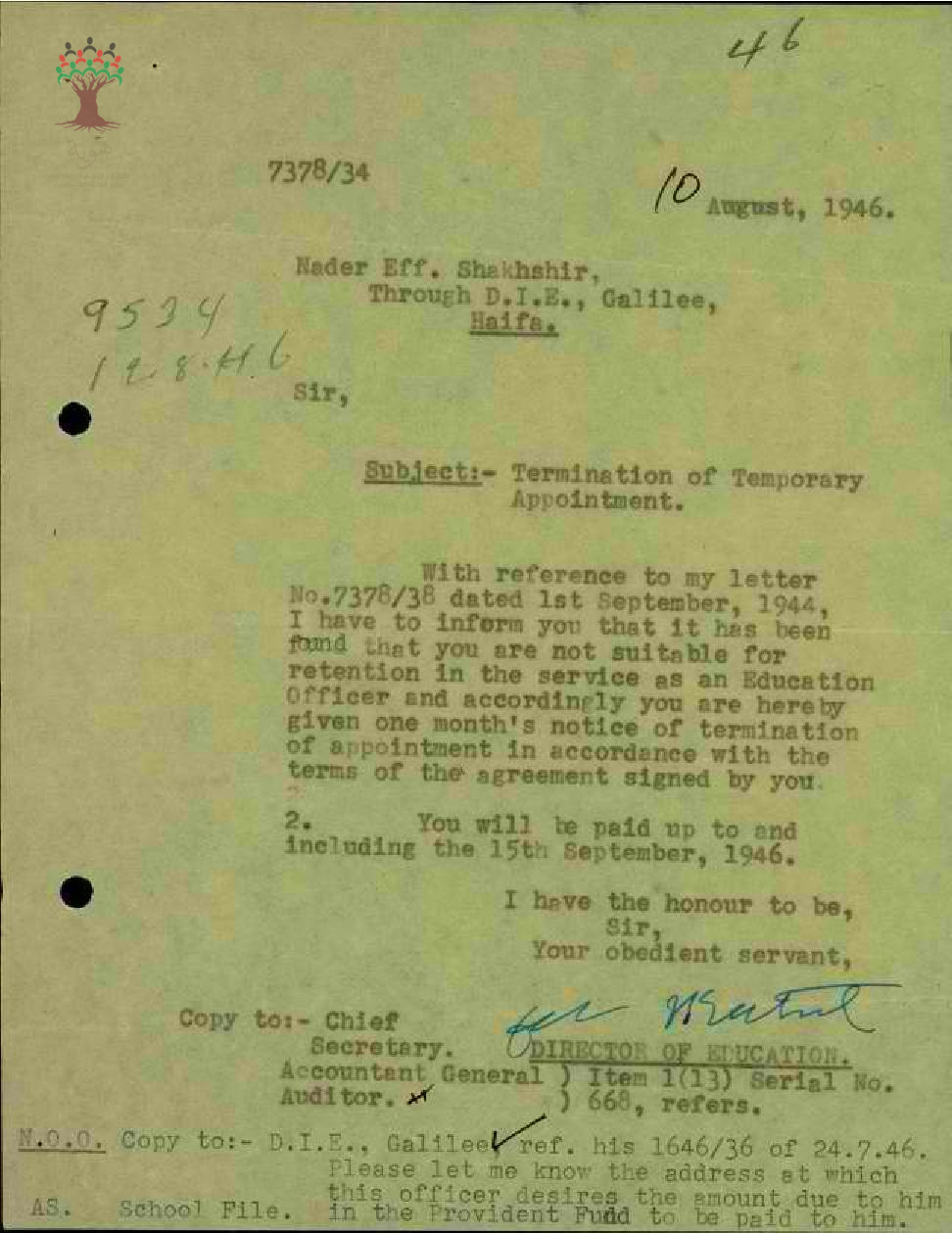 رسالة من مدير المعارف الى مفتش المعارف بخصوص نهاية خدمة المعلم نادر الشخشير