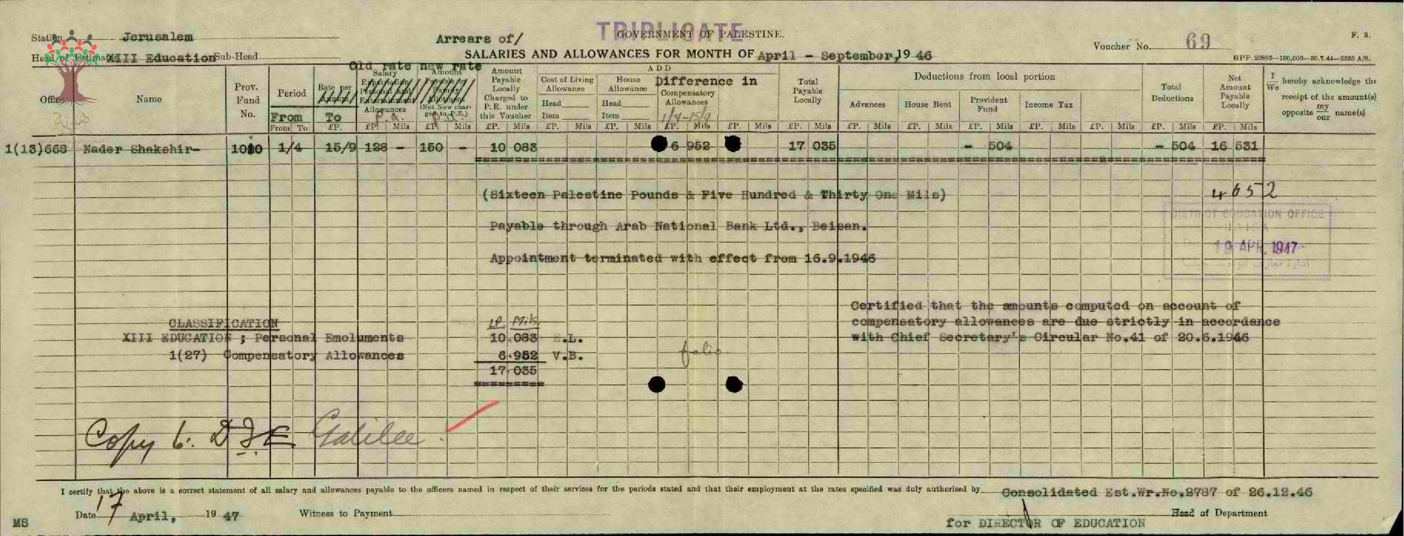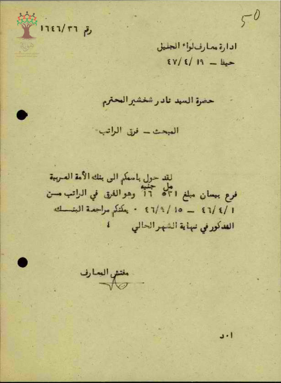 رسالة من مفتش المعارف الى المعلم نادر الشخشير بخصوص فرق الراتب
