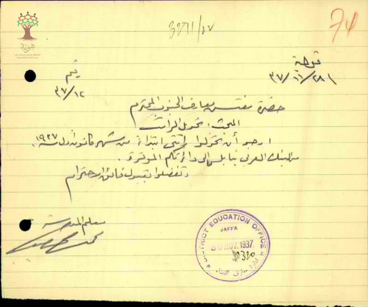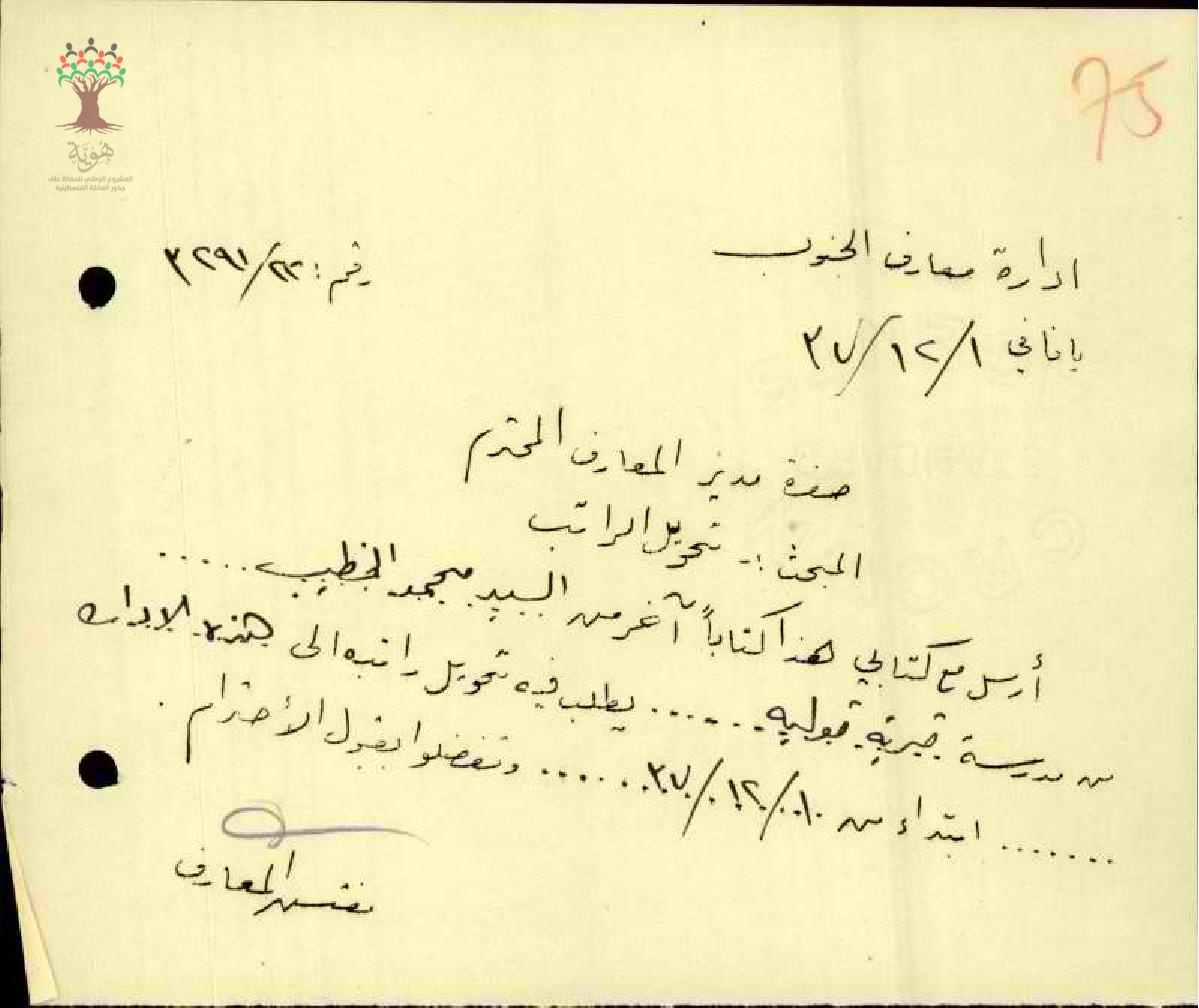 رسالة من المعلم محمد الخطيب إلى مفتش المعارف يطلب تحويل راتبه من البنك العربي بنابلس إلى الدائرة