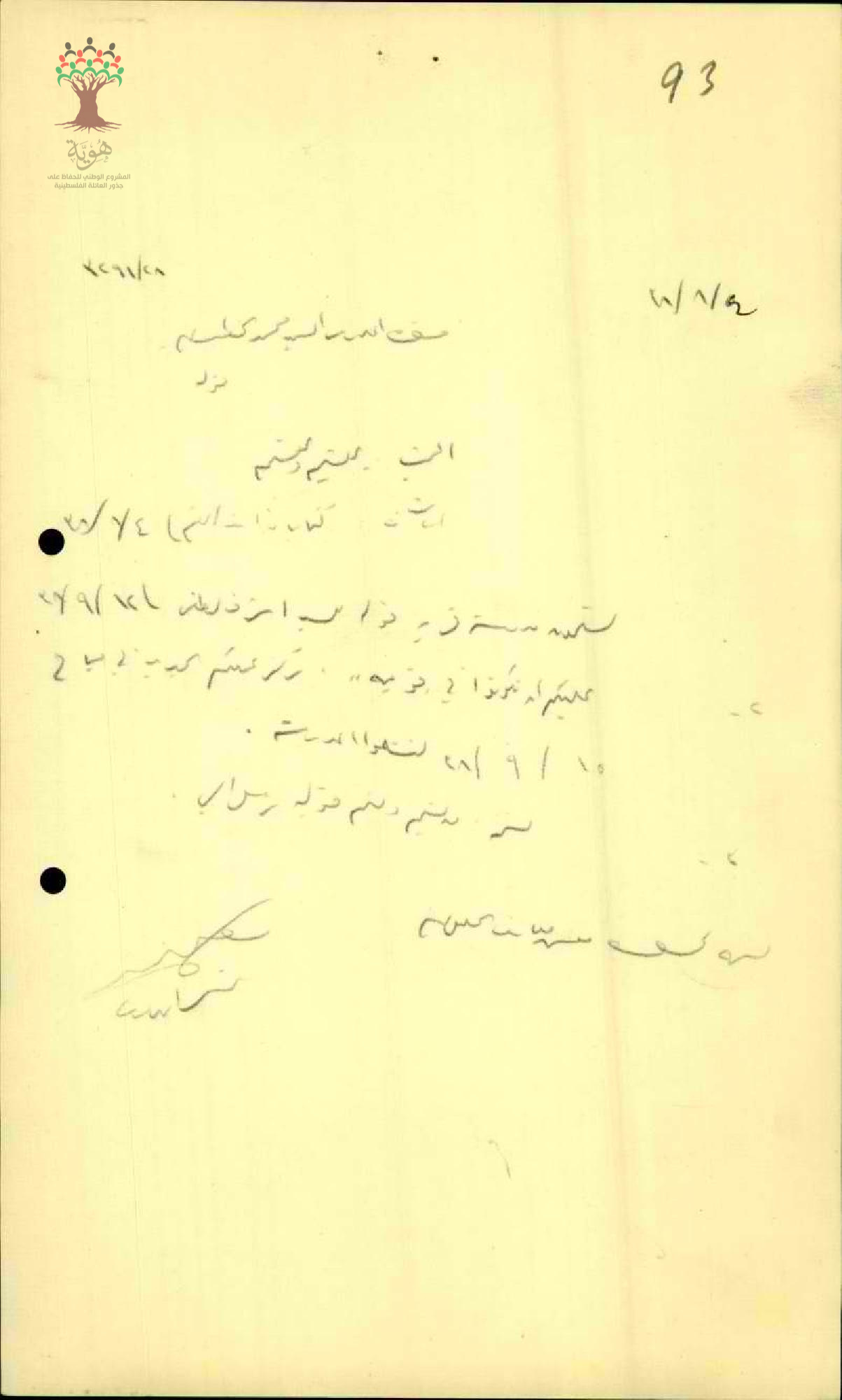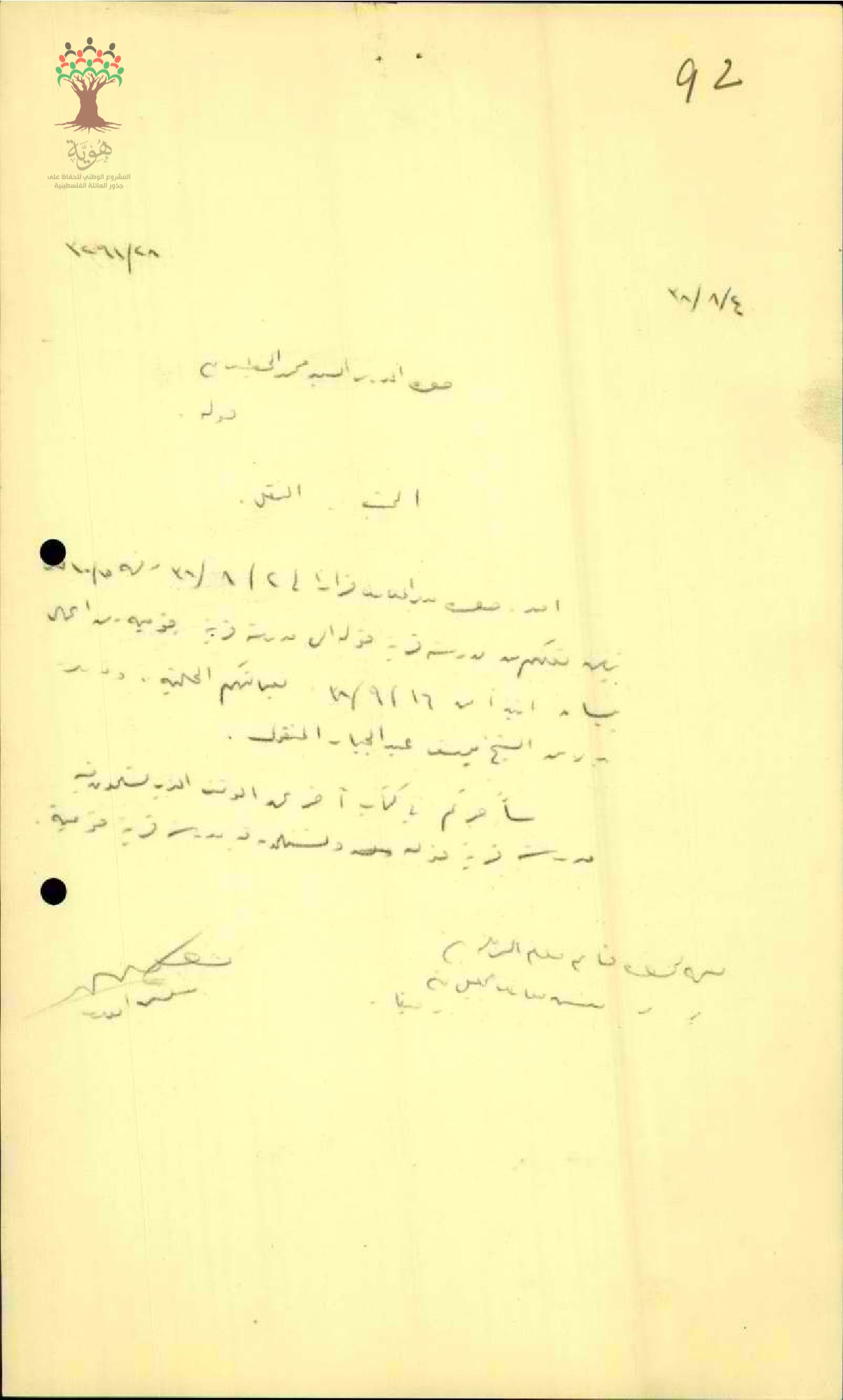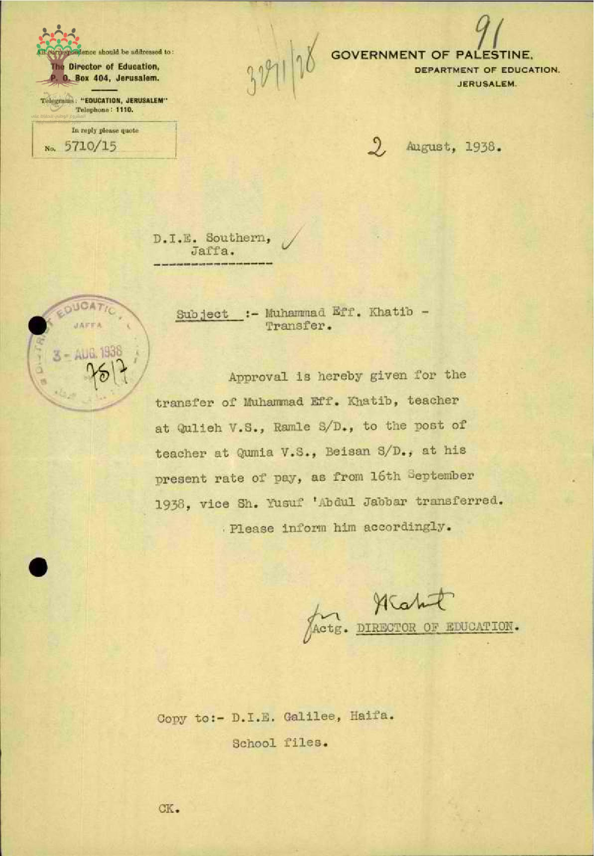 رسالة من مفتش المعارف إلى المعلم محمد الخطيب يخبره بقرار نقله من مدرسة قولية إلى مدرسة قومية