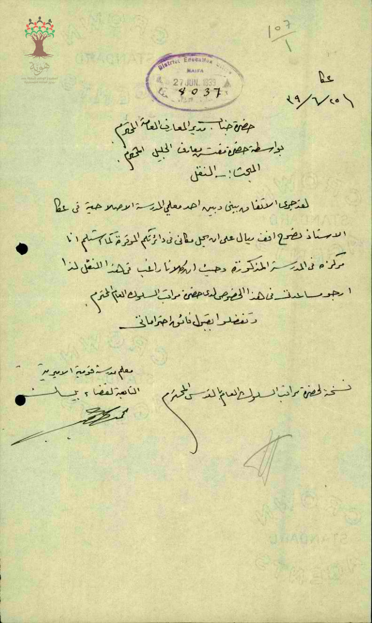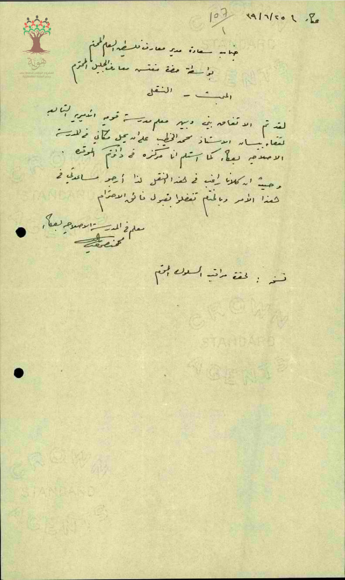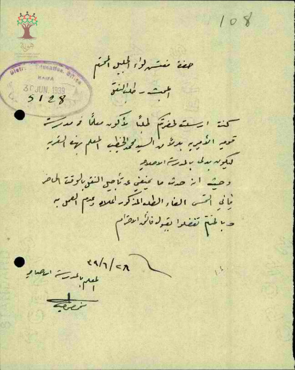 رسالة من معلم في المدرسة الاصلاحية بعكا إلى مفتش المعارف يخبره بالاتفاق بينه وبين المعلم محمد الخطيب بأن يحل محله في المدرسة