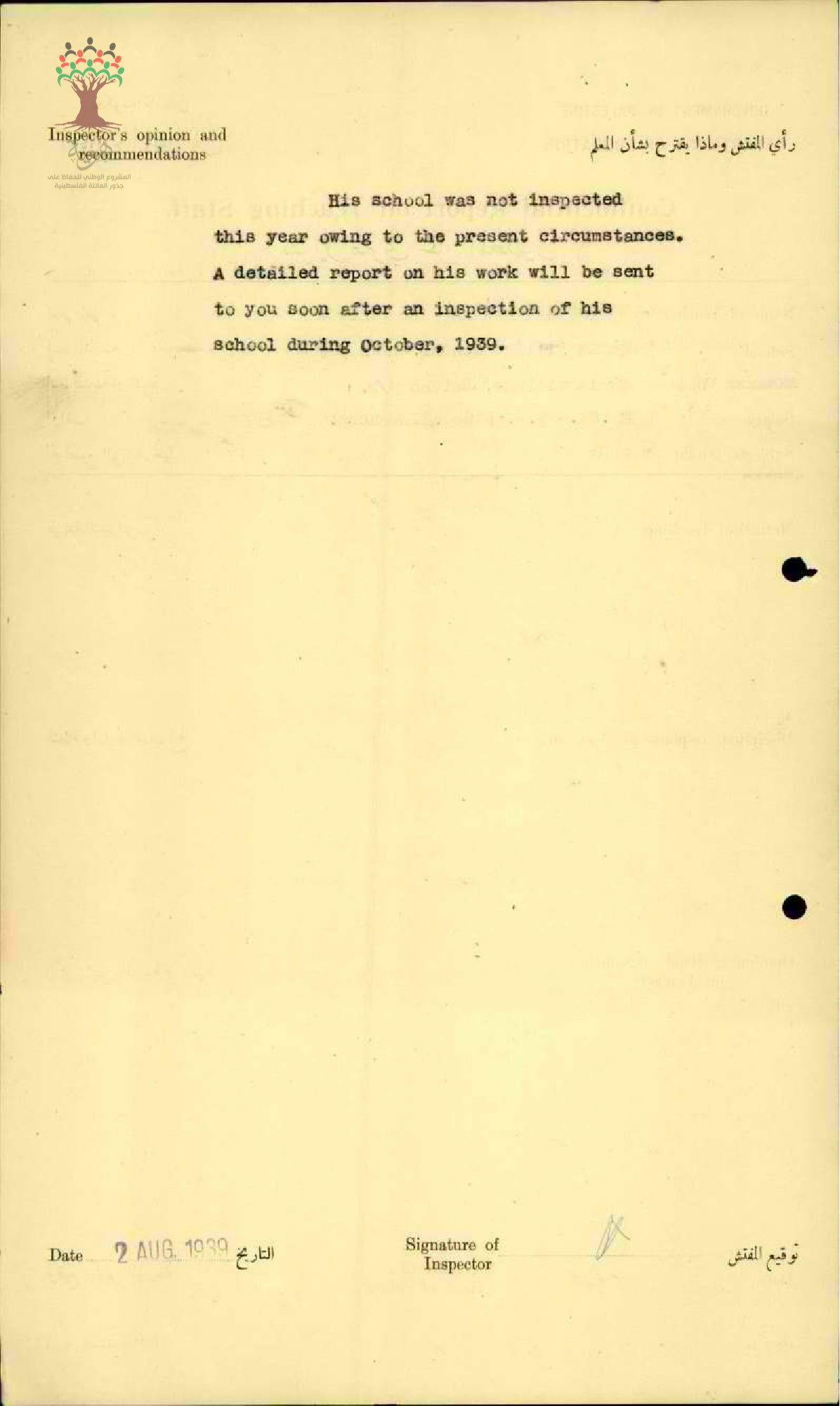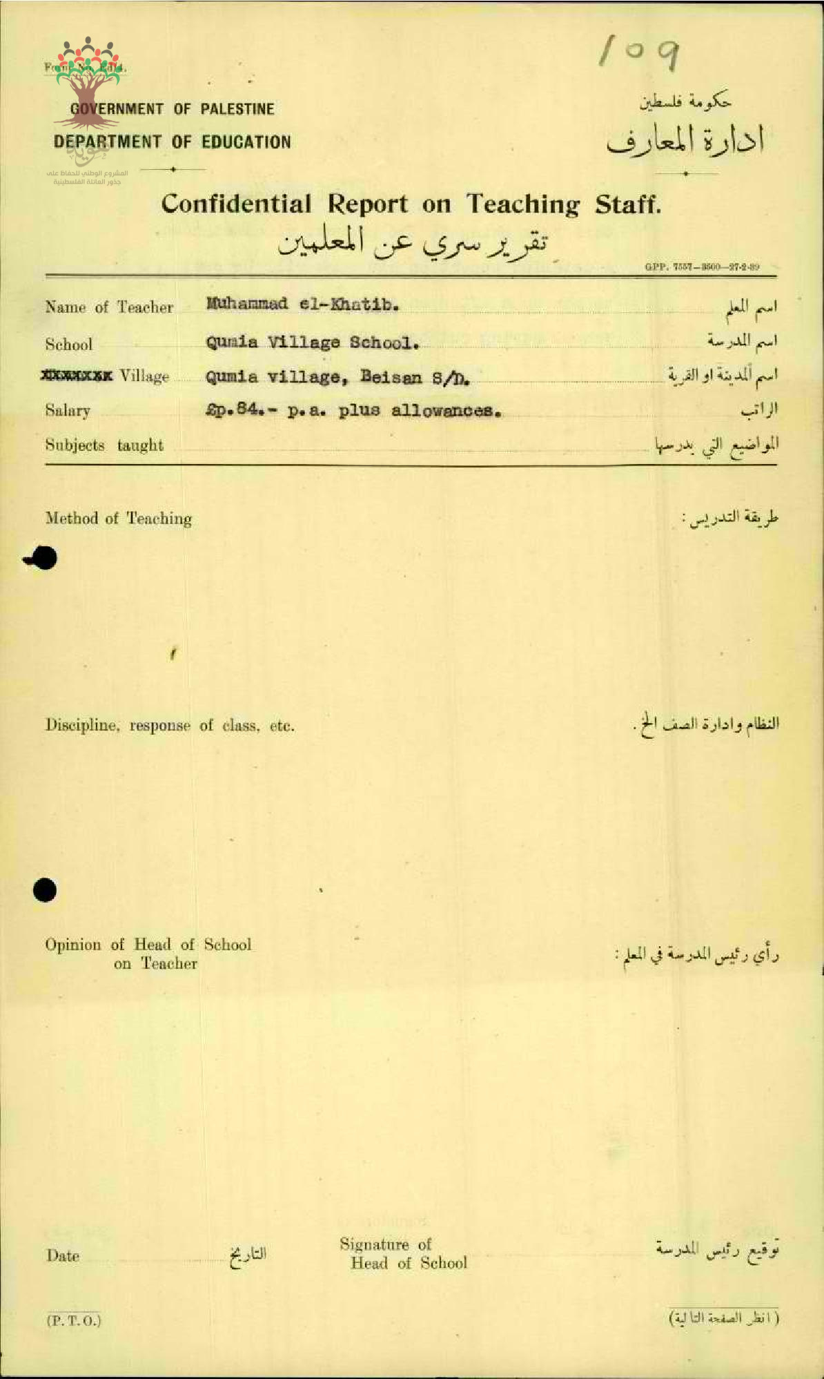 تقرير تفصيلي عن أداء المعلم محمد الخطيب في مدرسة قومية سنة 1939