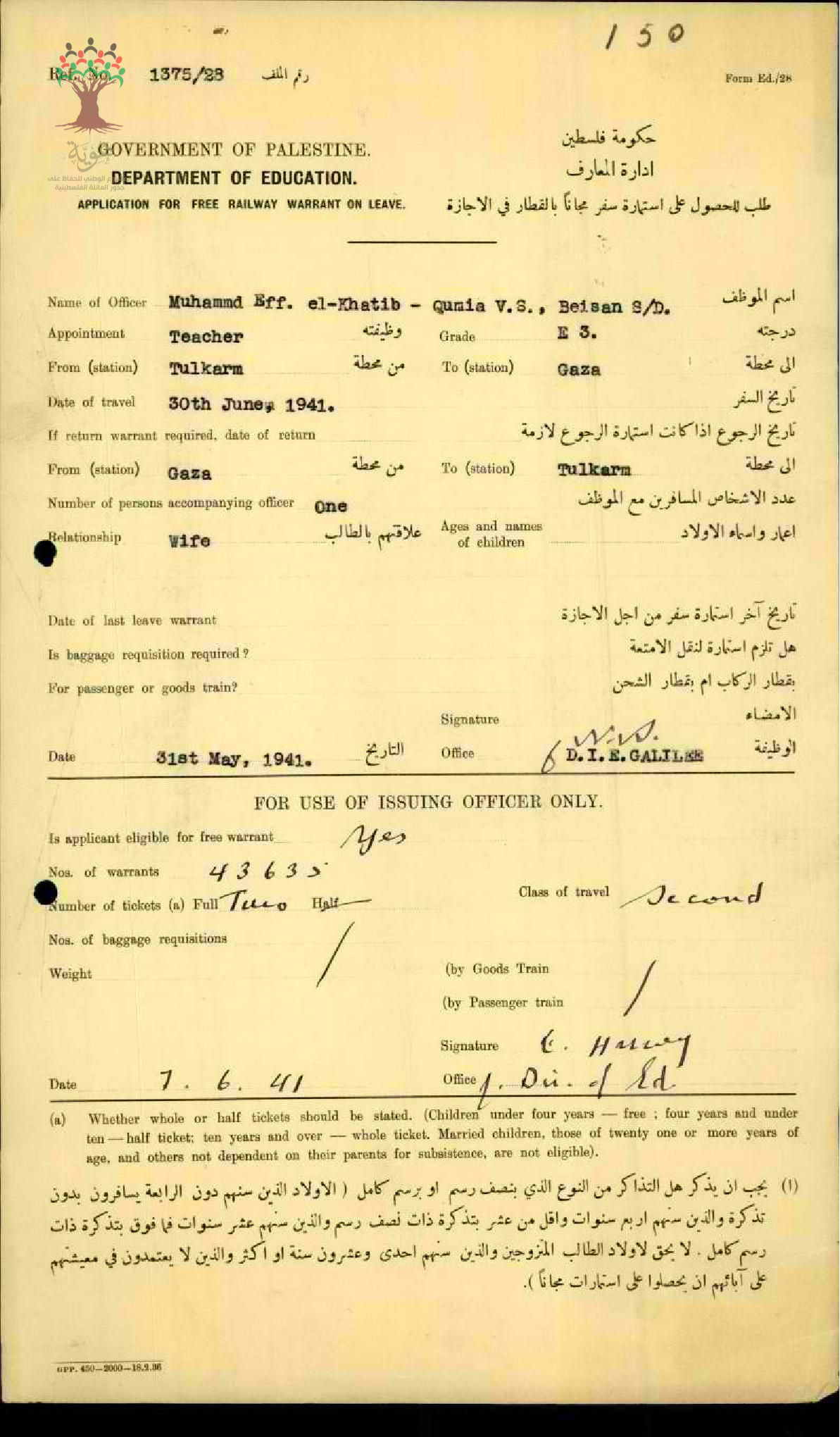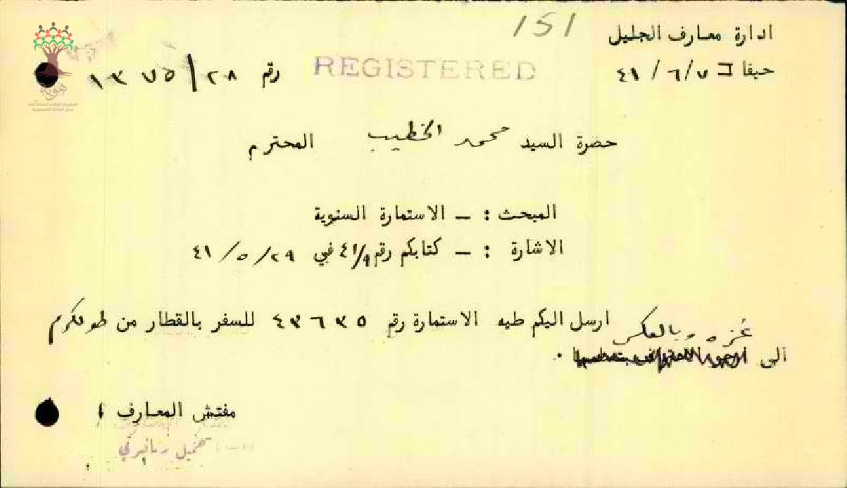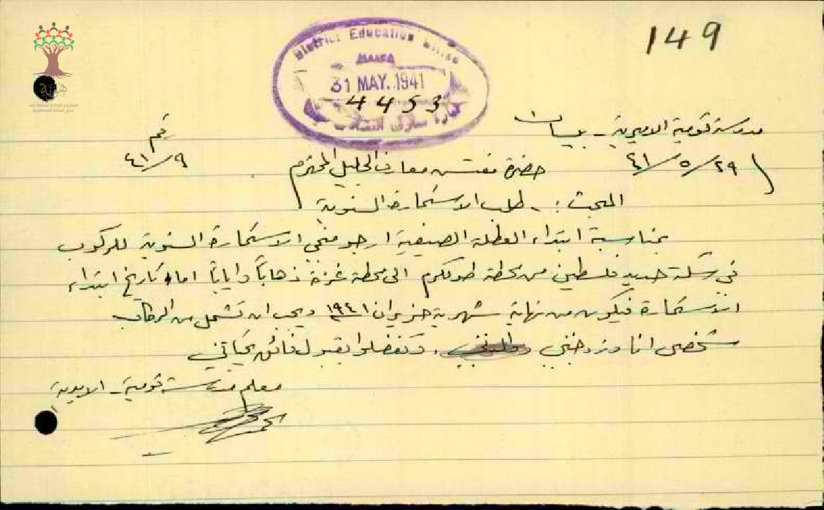 رسالة من المعلم محمد الخطيب إلى مفتش المعارف يطلب الاستمارة السنوية