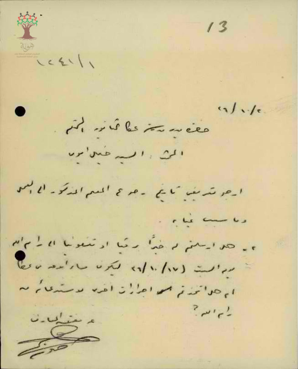 رسالة من مفتش المعارف الى مدير مدرسة عكا يسأل عن سبب غياب المعلم خليل ايوب وتاريخ عودته الى العمل