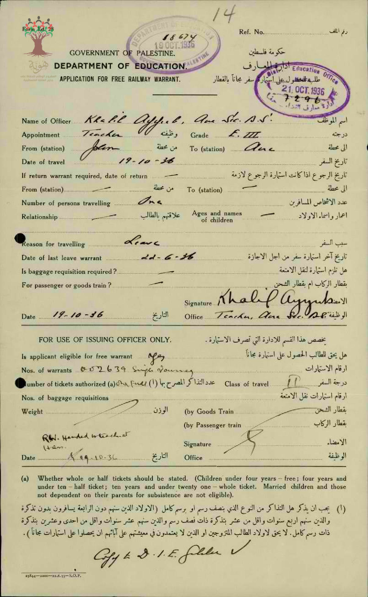 استمارة سفر مقدمة الى المعلم خليل ايوب/رام الله