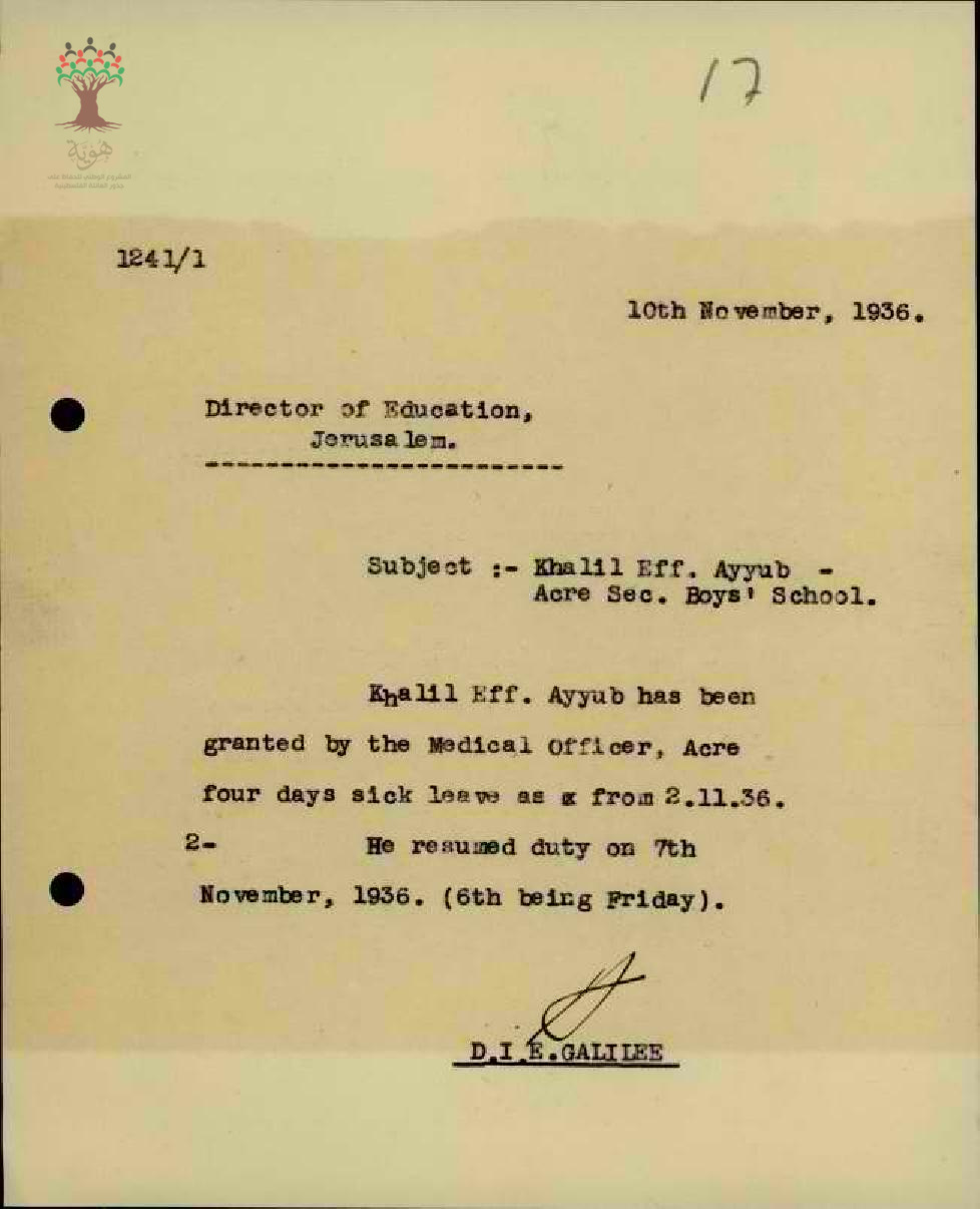 رسالة من مفتش المعارف الى مدير المعارف بخصوص اجازة مرضية للمعلم خليل ايوب وعودته للعمل
