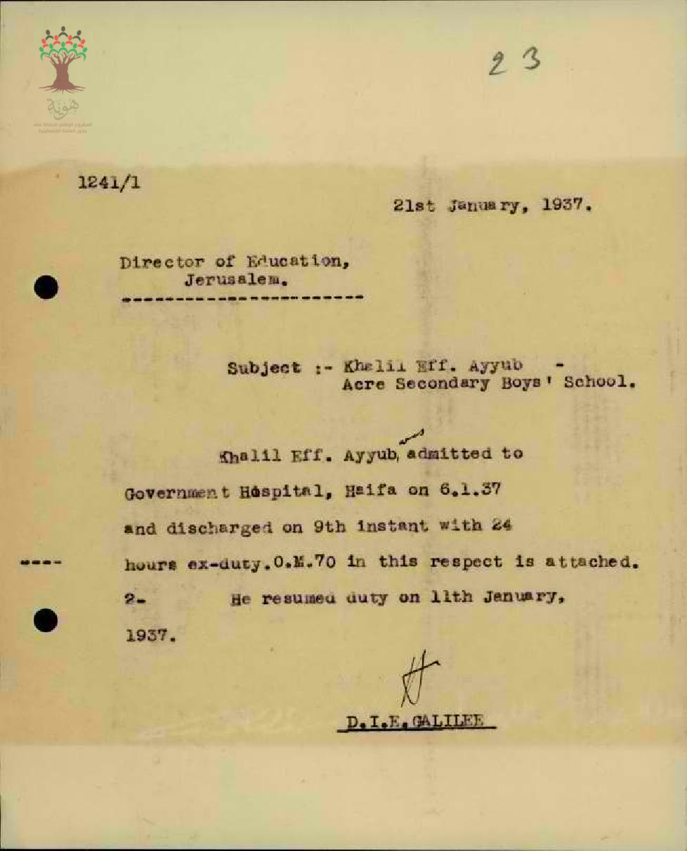 رسالة من مفتش المعارف الى مدير المعارف بخصوص تغيب المعلم خليل ايوب وعودته الى العمل