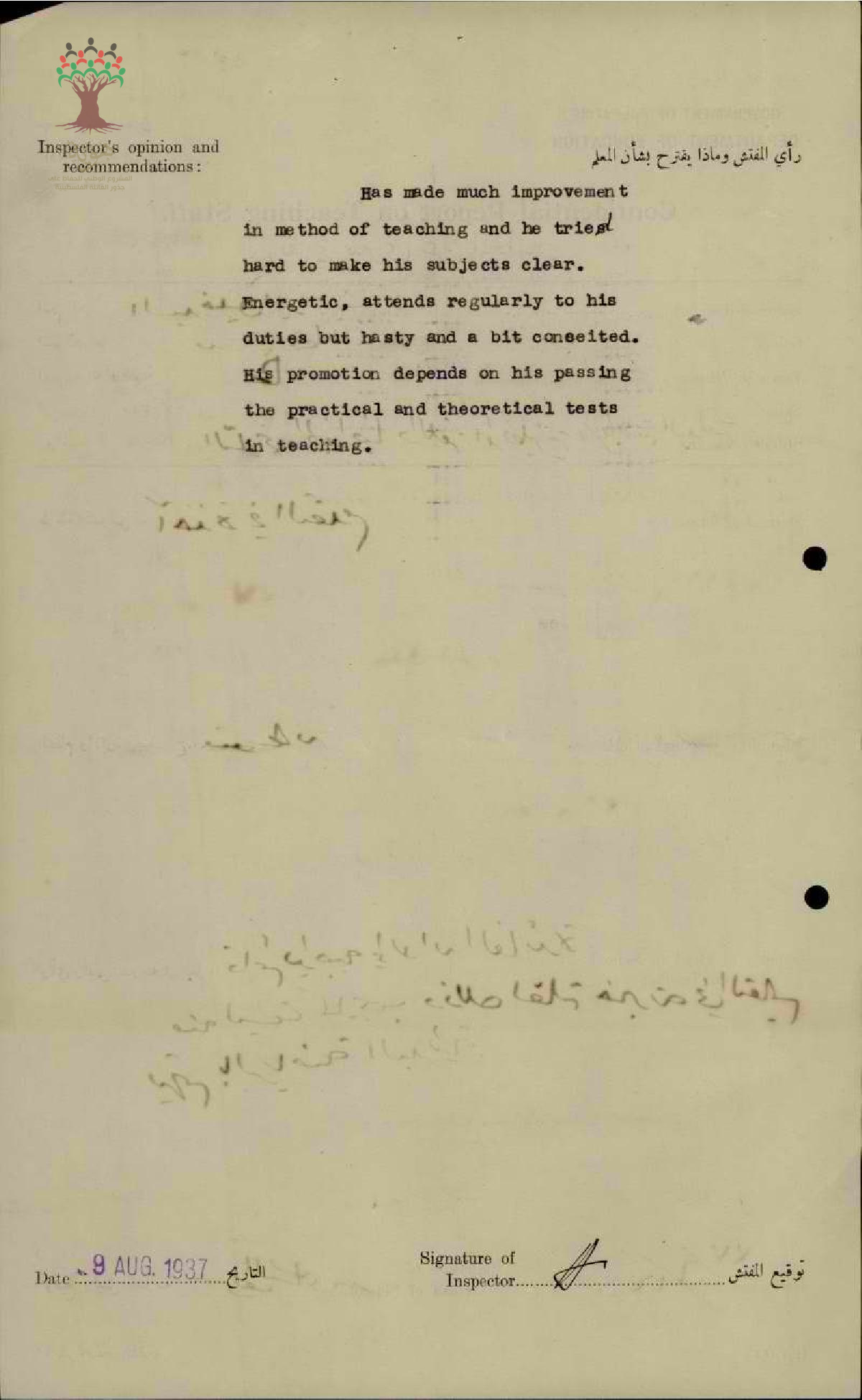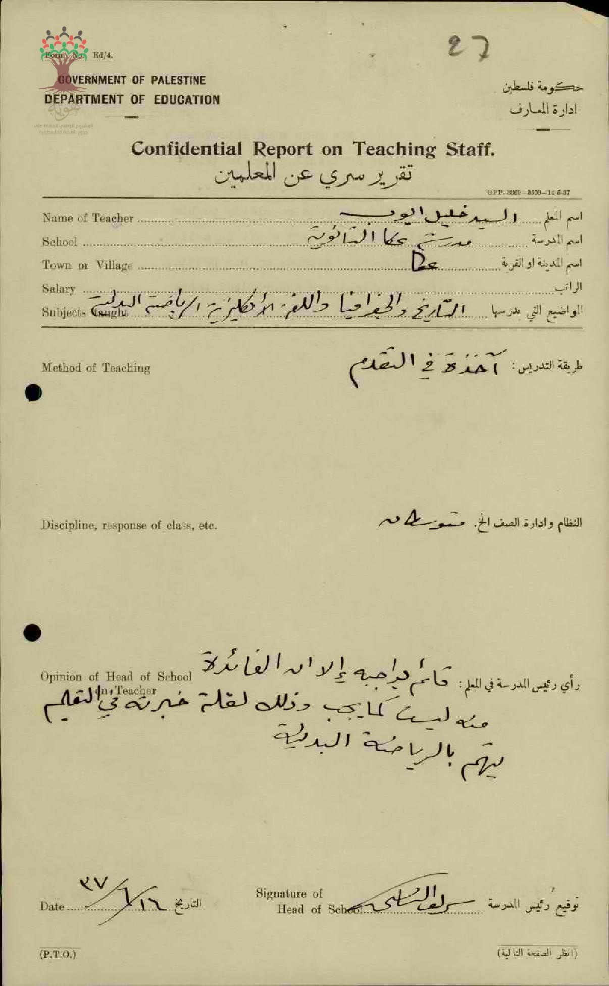 تقرير تفصيلي عن أداء المعلم خليل ايوب في مدرسة عكا الثانوية سنة 1937