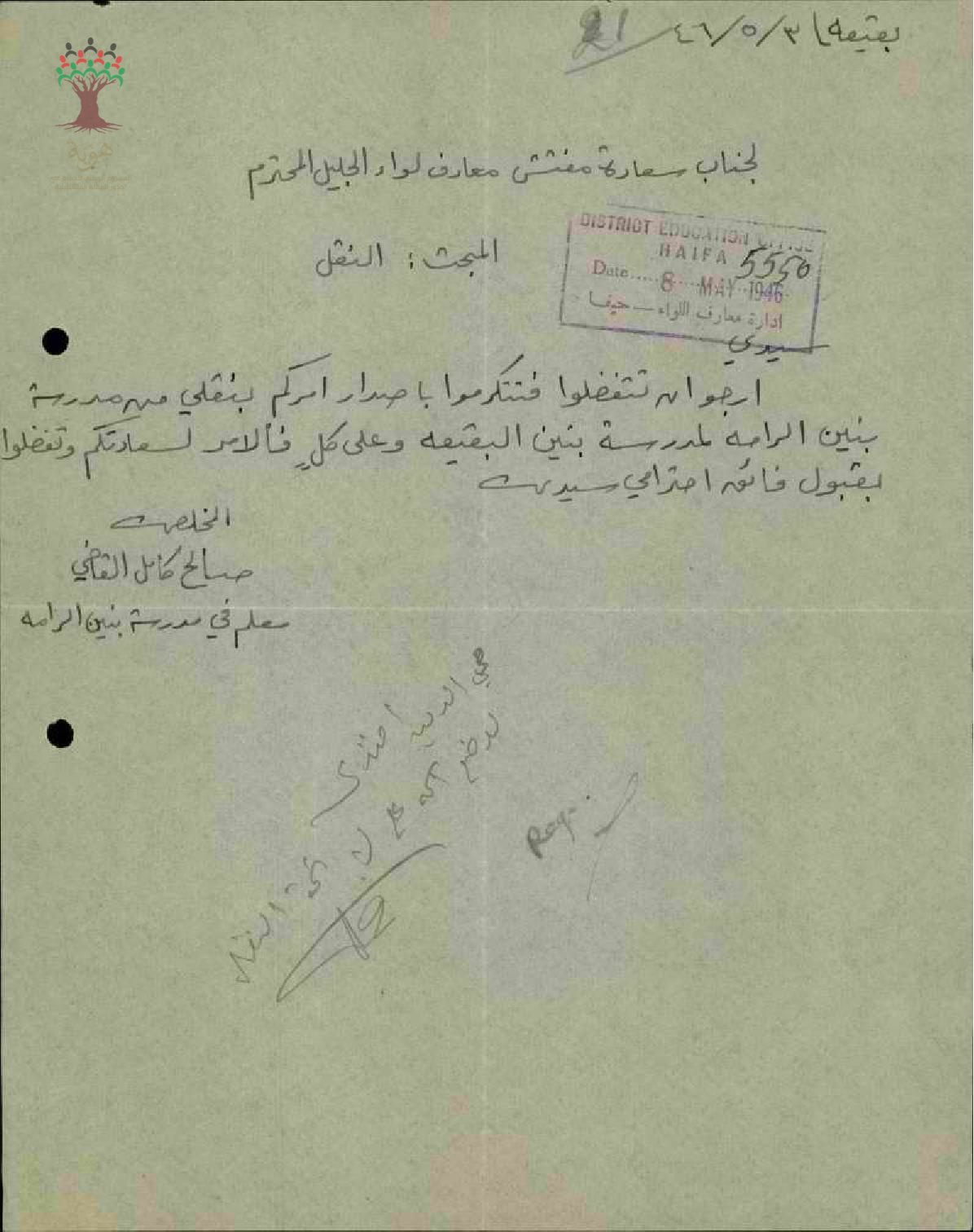 رسالة من المعلم صالح القاضي الى مفتش المعارف يطلب فيها نقله الى البقيعة