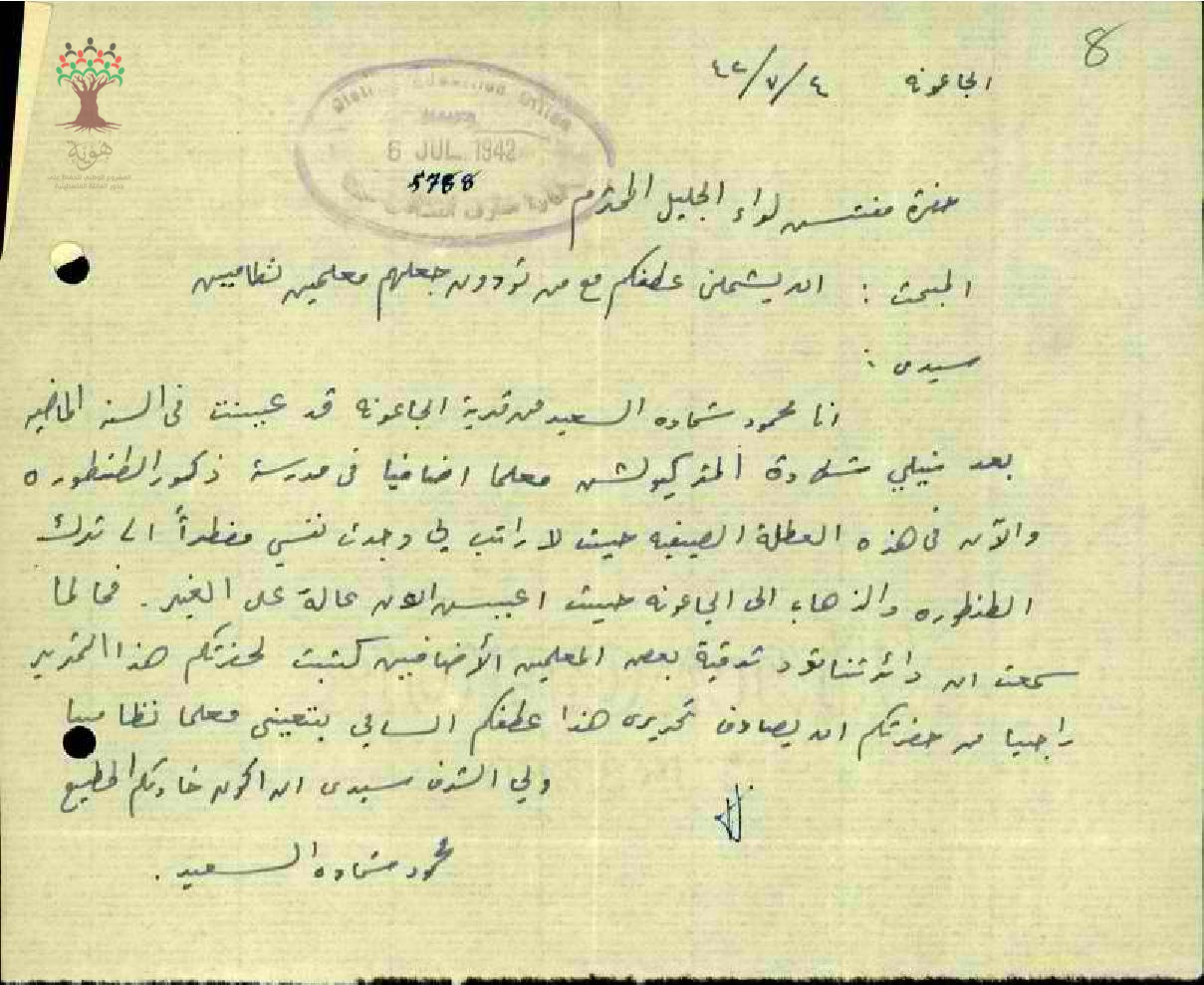 رسالة من المعلم محمود السعيد إلى مفتش المعارف يطلب منه تعينه معلماً نظامياً في الإدارة
