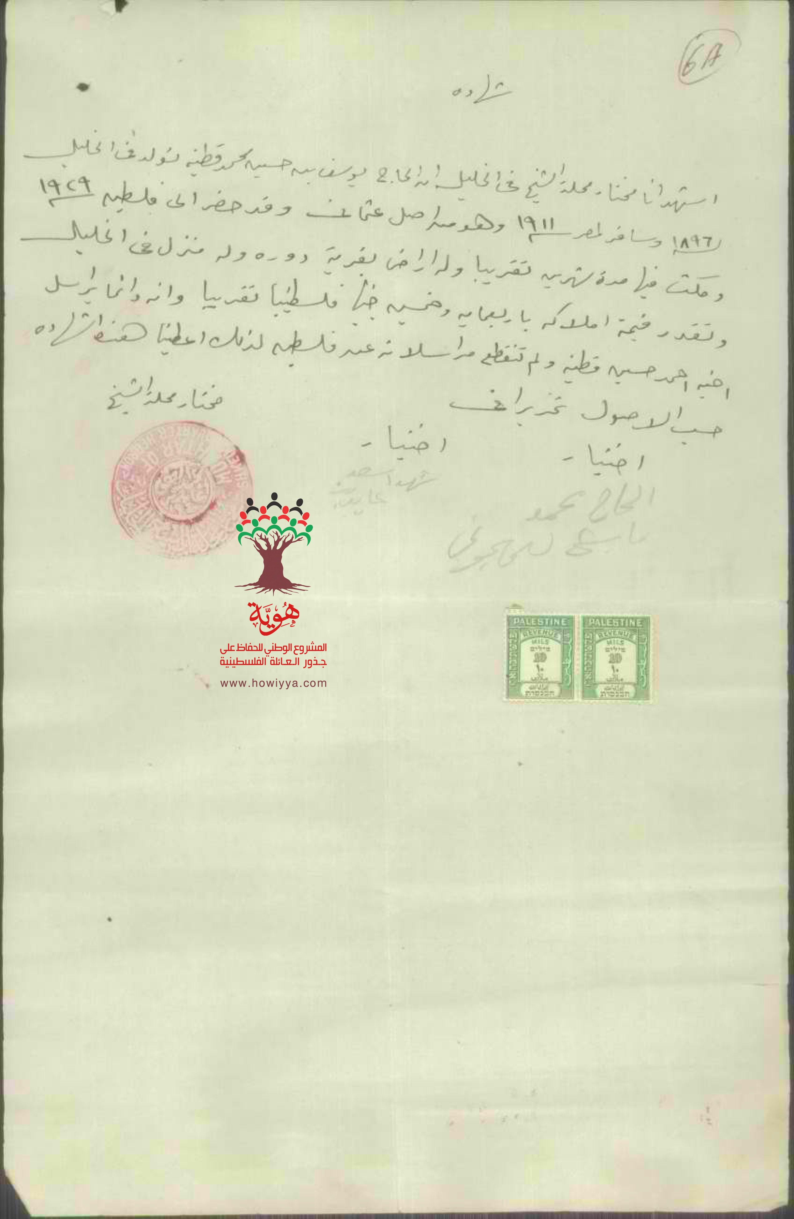 شهادة من مختار محلة الشيخ في الخليل بخصوص طلب الجنسية للسيد يوسف قطينة