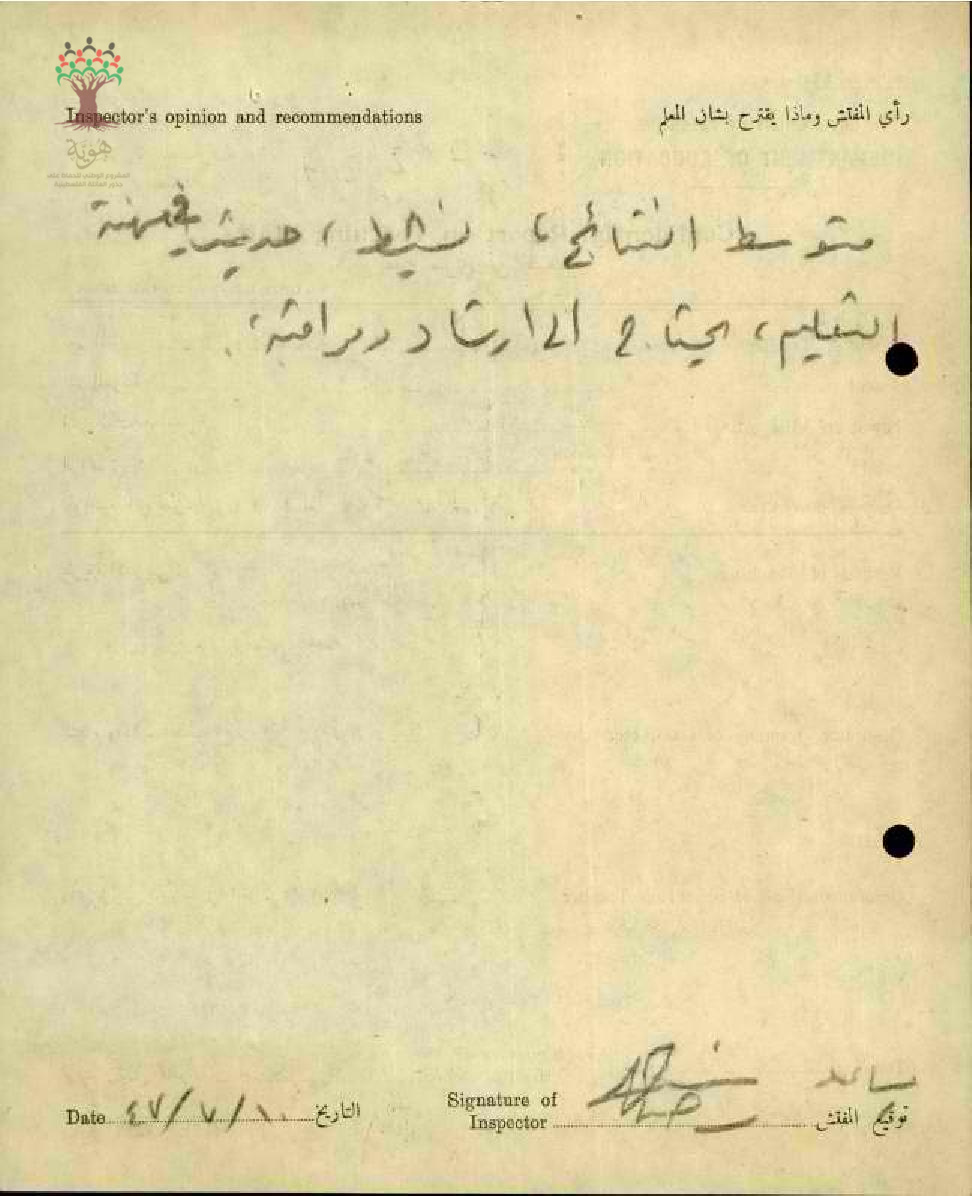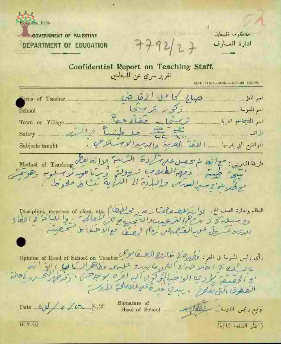 تقرير تفصيلي عن أداء المعلم صالح القاضي في مدرسة ترشيحا للذكور سنة 1947